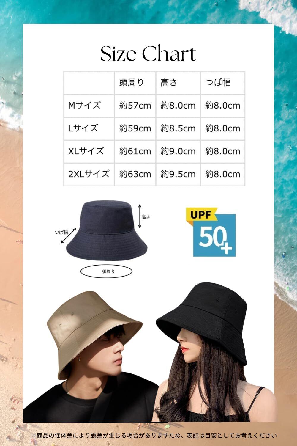 大きめのつばで小顔効果もあり、紫外線保護指数は最高値の50+ですのでUVカット効果が高いです。