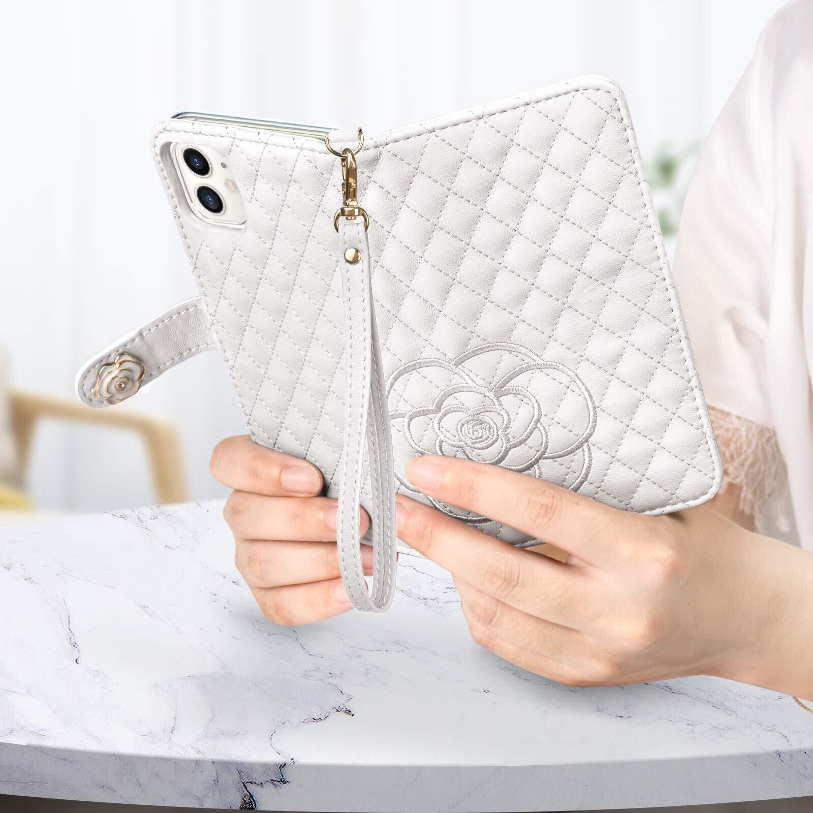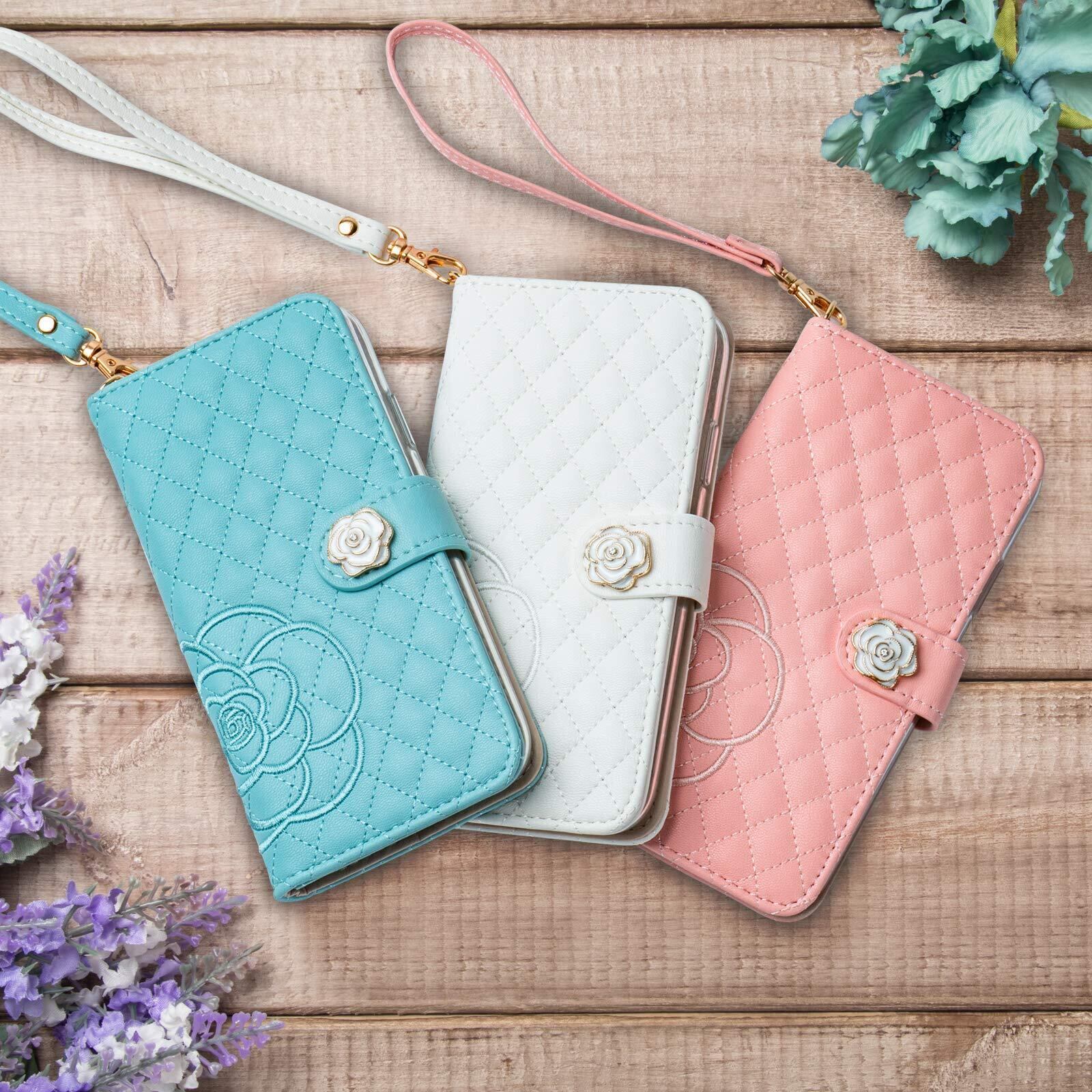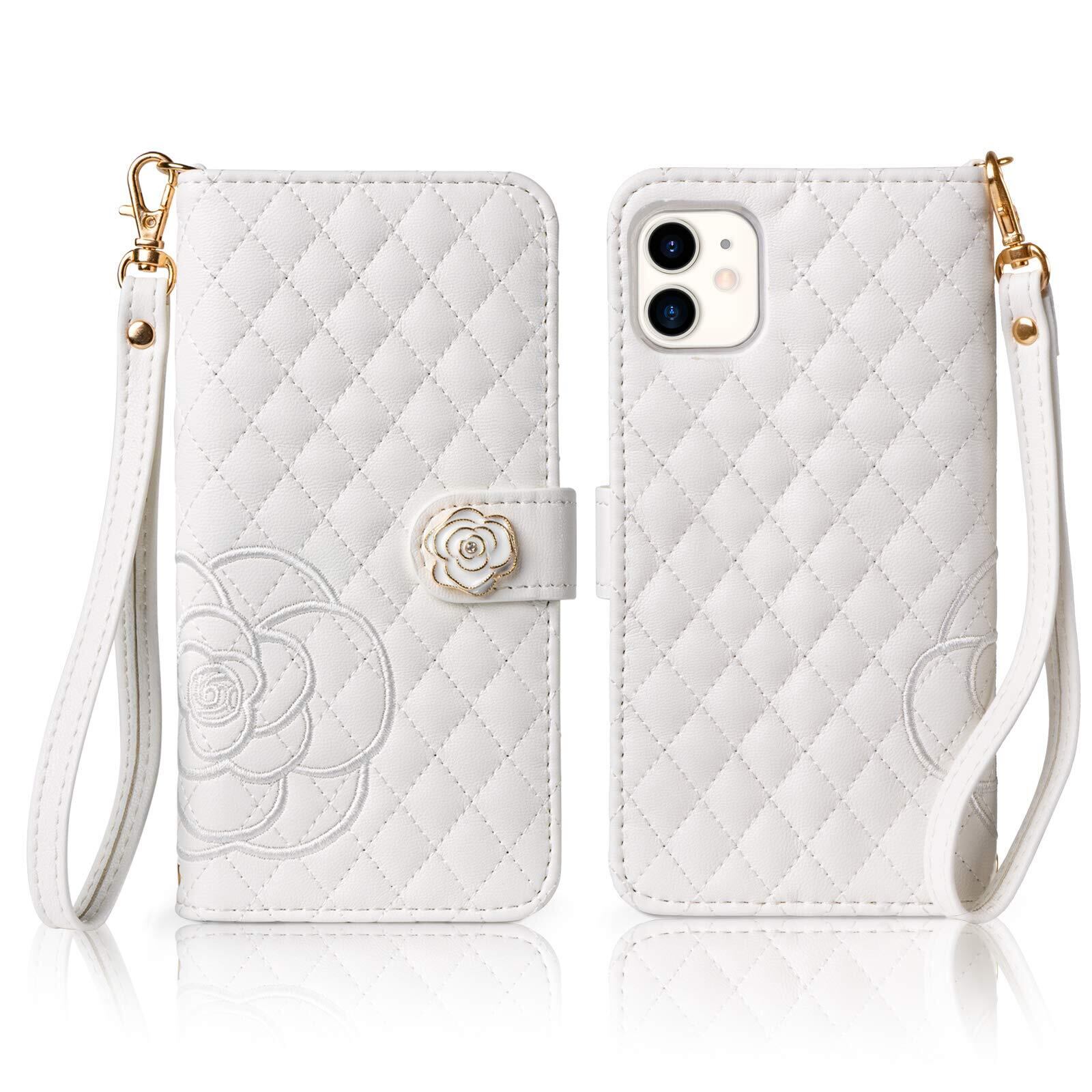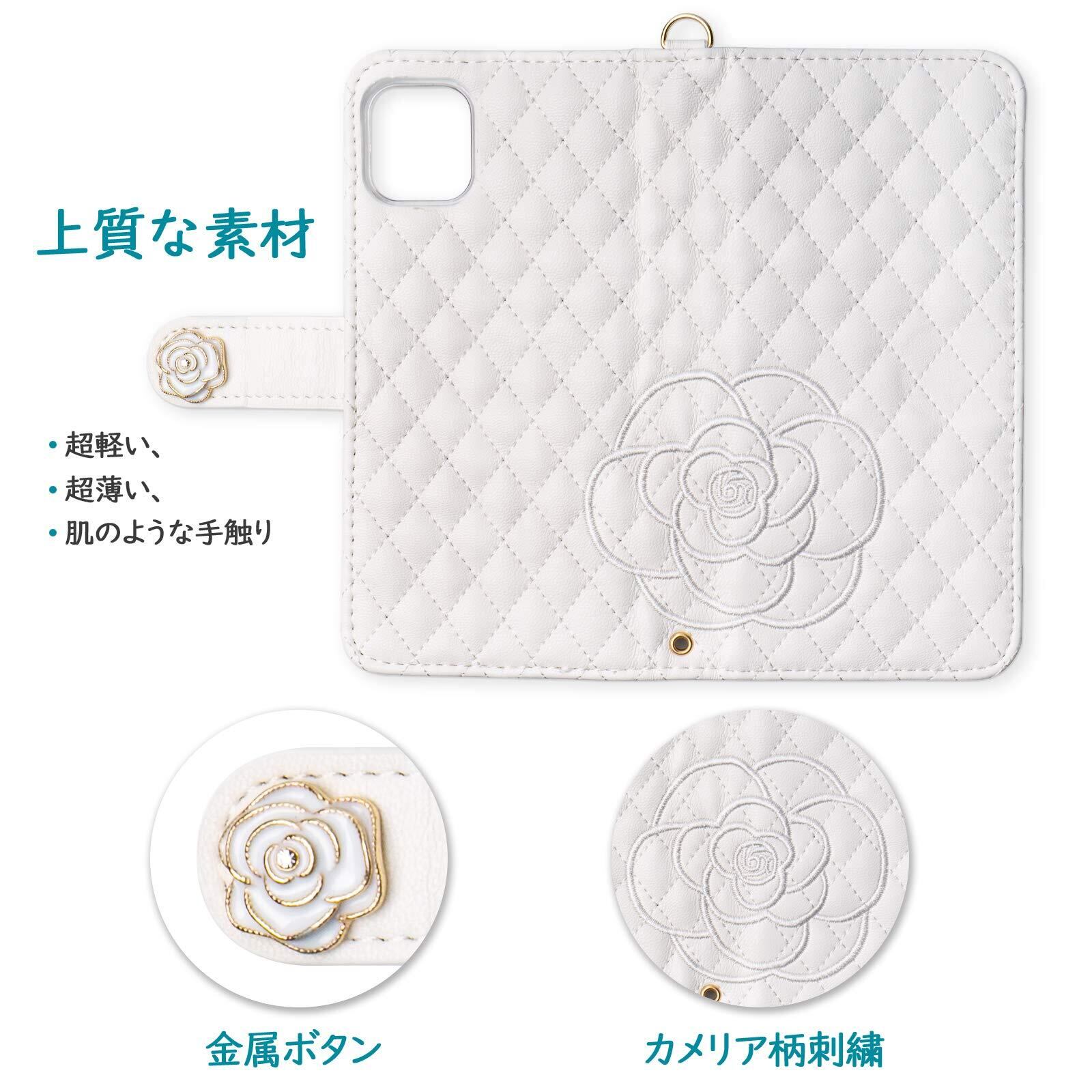 SZjamie 手帳型ケース 用の iphone12 /12 Pro ケース 財布型 薔薇 カメリア花柄 刺繍 上質な手触り 可愛い カワイイ かわいい デザイン ピンク 耐衝撃 全面保護 カード収納 マグネット式 横置き機能 スタンド機能 ハンドストラップ付きで持ち運び便利 プレゼントにも最適 手帳型スマホカバー(12 /12 Pro 用の スマホケース, ホワイト)