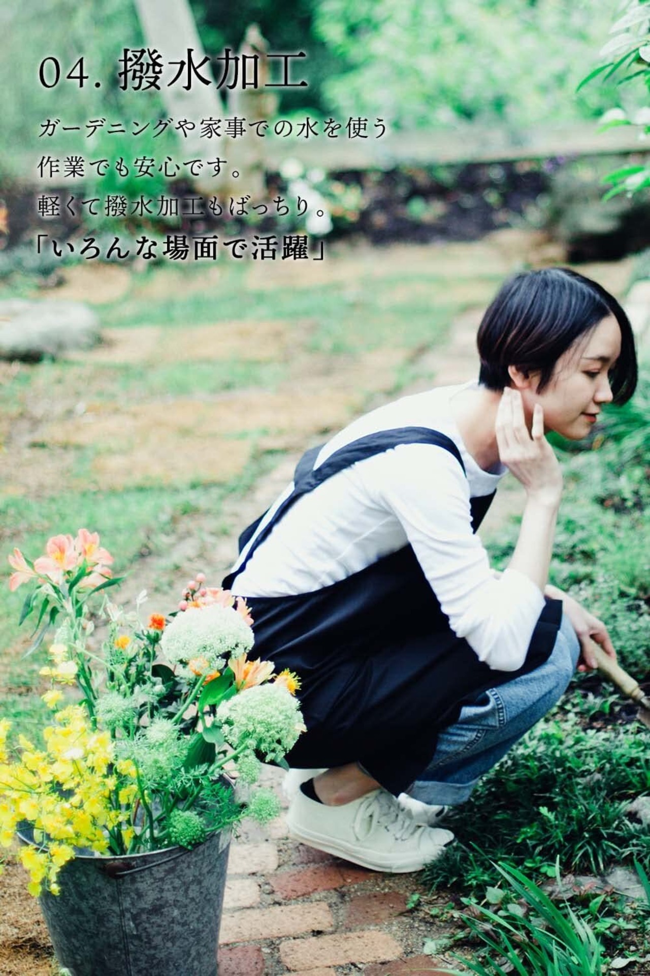 【撥水加工】ガーデニングや家事での水を使う 作業でも安心です。 軽くて撥水加工もばっちり。 「いろんな場面で活躍」