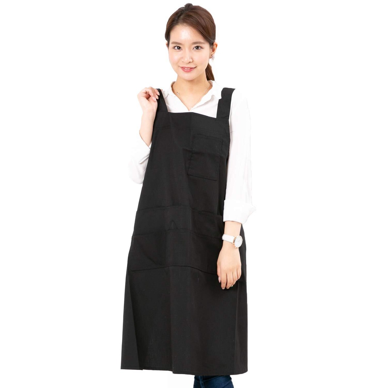 【簡単着脱】紐なしタイプエプロンなのでサッと着脱可能!