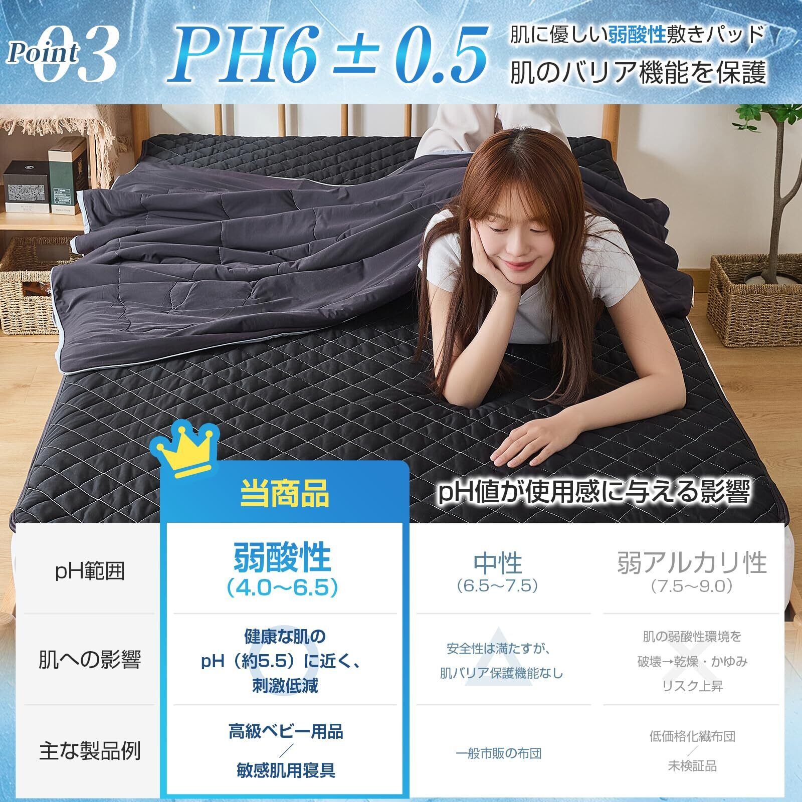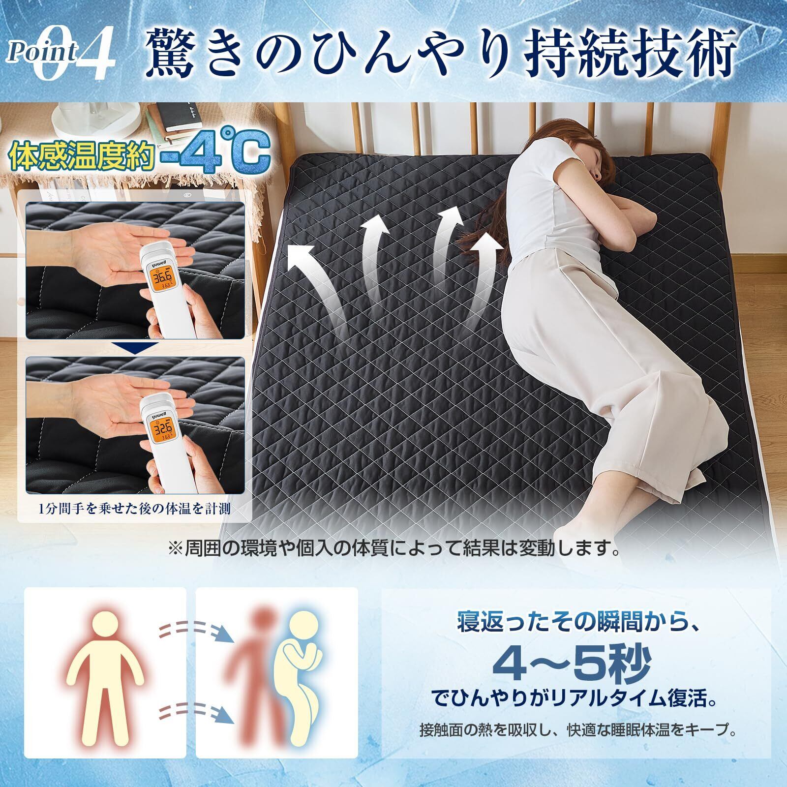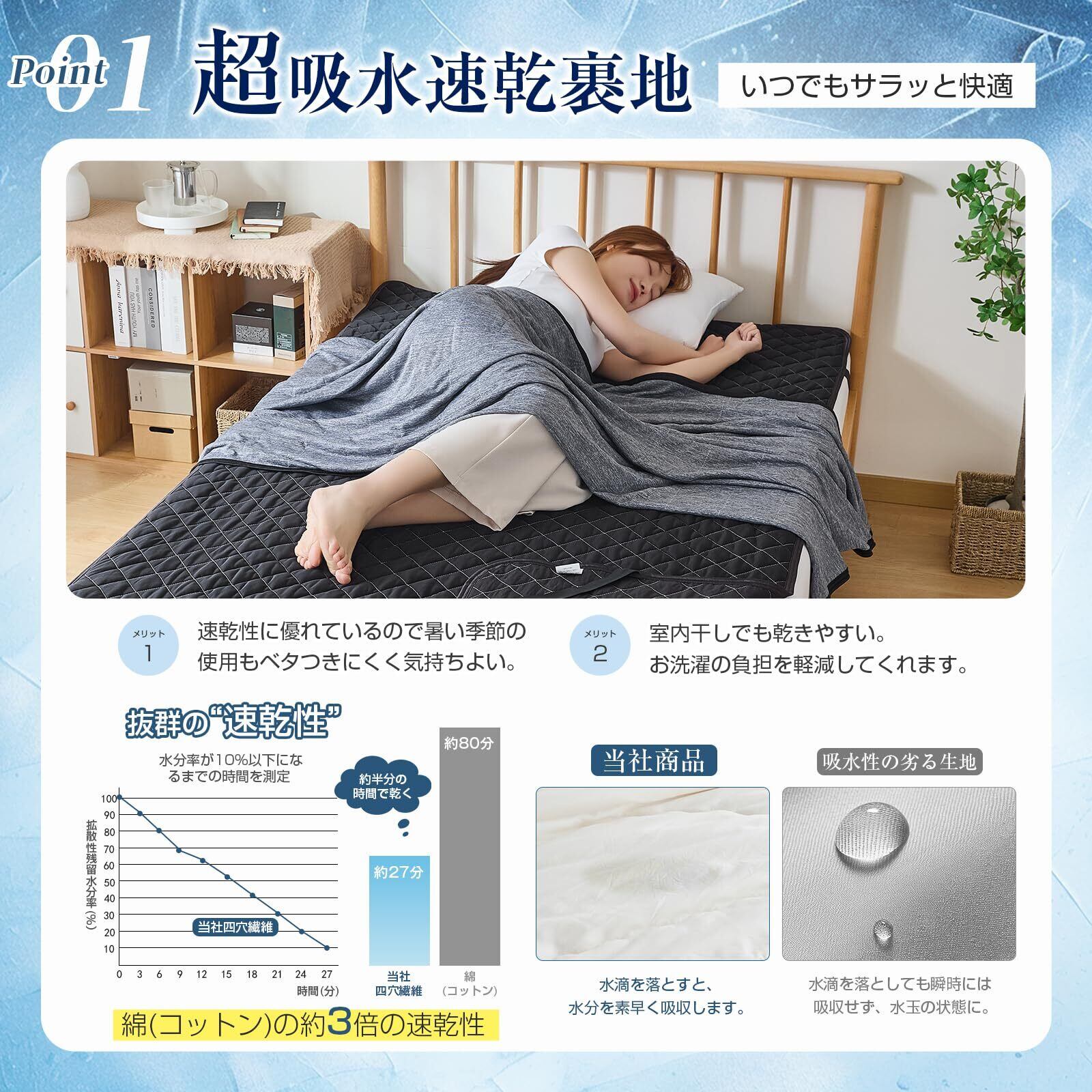 【冷感敷きパッド·商品情報】サイズ:シングル夏用敷きパッド100x200cm 「素材·軽量な五層構造」(表)ナイロン100%接触冷感生地Q-Max 0.46+超柔不織布(中)ポリエステル80%·帝人(TEIJIN)綿10%+超柔不織布(裏)ソフト化加工なポリエステル生地·吸湿速乾·。寝苦しい夏の夜、体温がお布団と体の間にこもり、暑苦しく感じます。そんな時期におすすめなのが、ひんやり心地良い「接触冷感寝具」です。同ブランドの接触冷感寝具と合わせれば、ひんやり効果倍増。