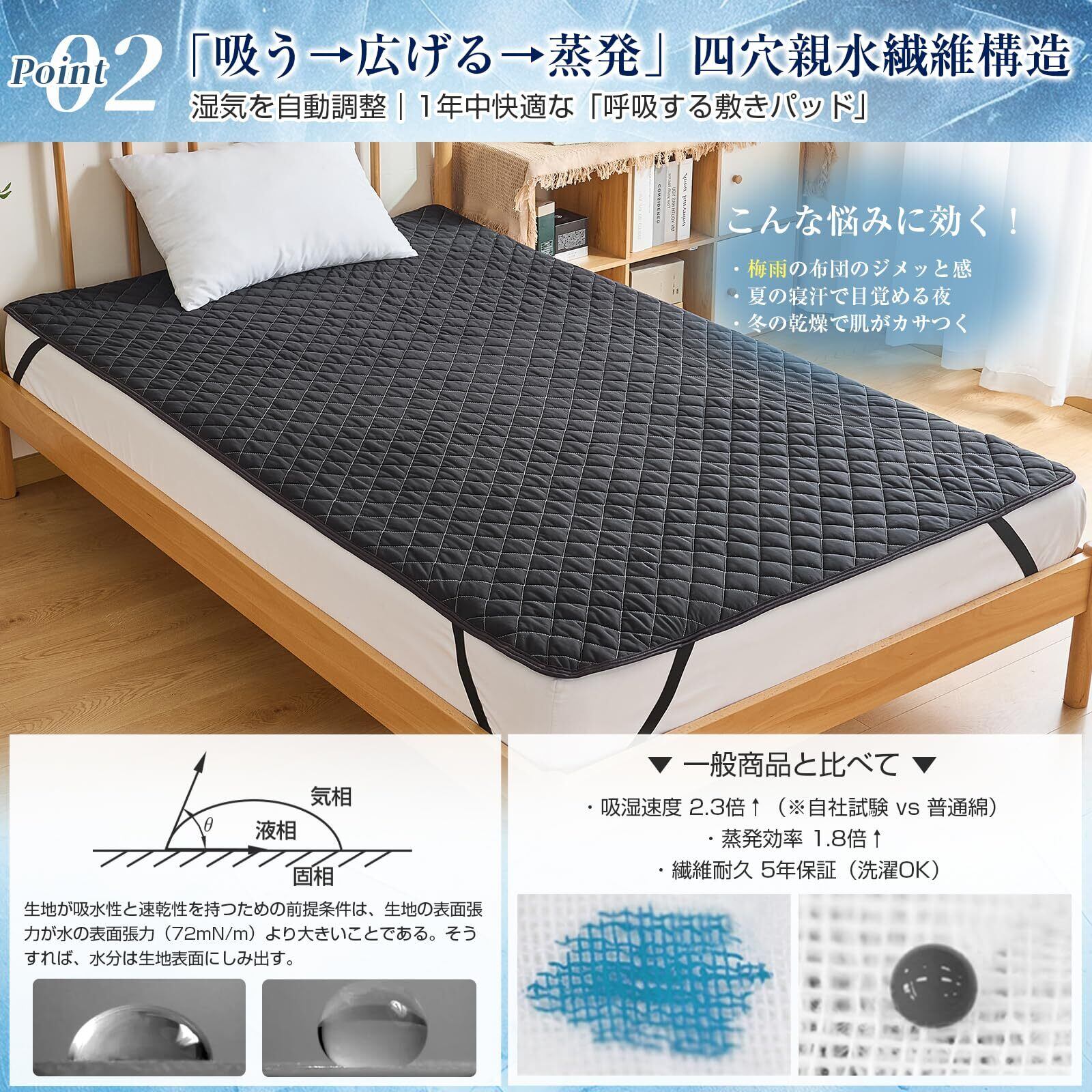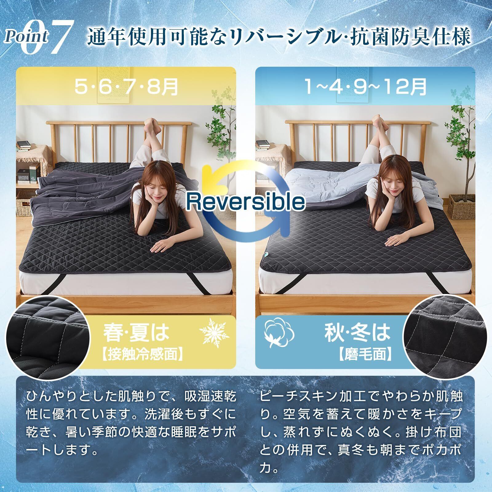 【リバーシブル仕様!裏面は吸湿速乾の布団敷きパッド】革新のダブル仕様。冷感ナイロン面の裏側は、吸湿速乾に優れた水洗い磨毛ポリエステル。柔らかく肌馴染むこの面は、梅雨時や肌寒い季節に大活躍する敷パットです。夏は冷感面でひんやり、それ以外の季節は吸湿速乾面でさらり。どちらを上にしても、直接肌に触れるストレスを軽減します。