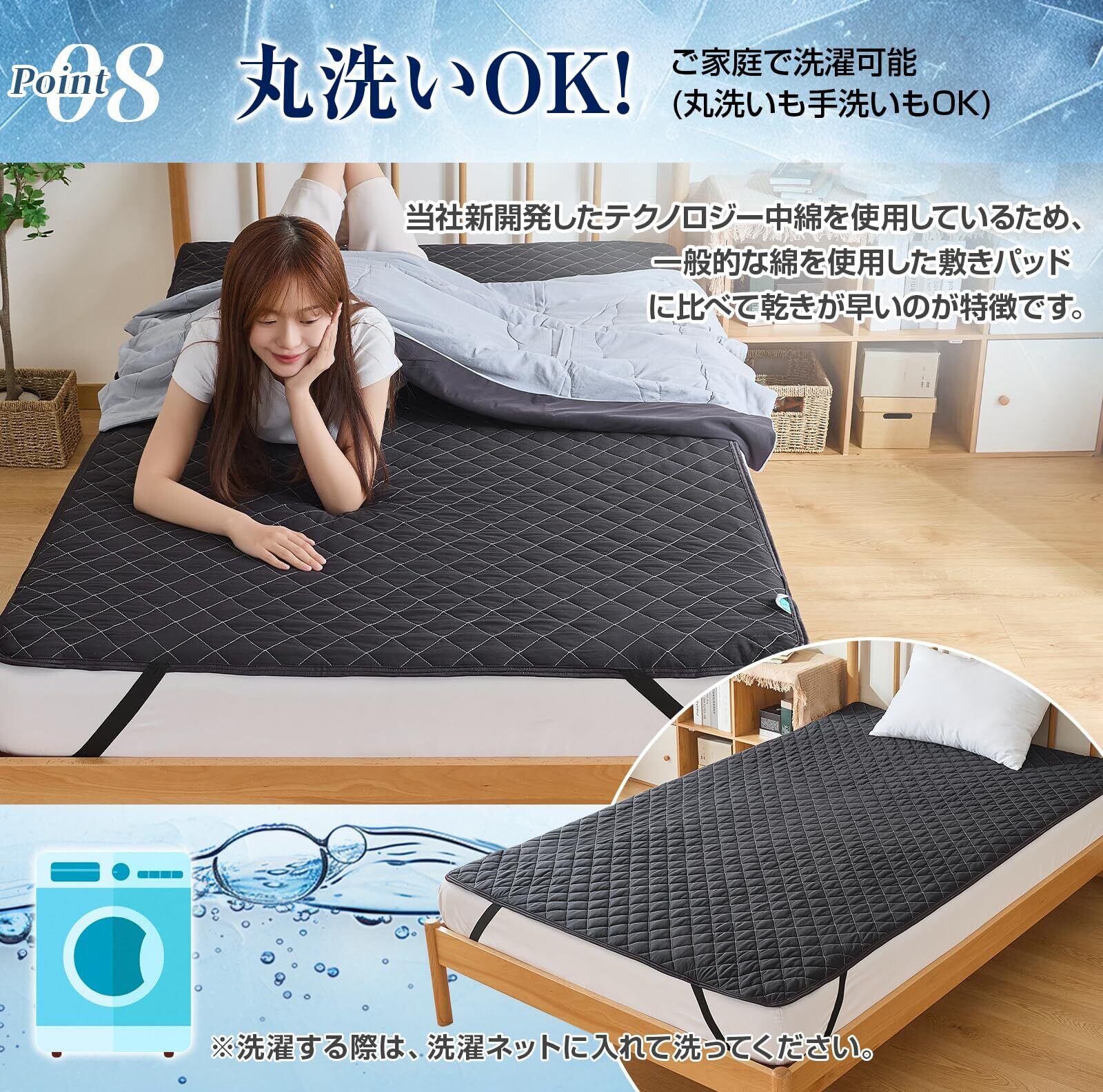 【四隅ゴムでしっかり防滑!ずれないベッドパッド·装着簡単】四隅に強化ゴムバンド付き、ズレ防止。3-30cmのマットレス・敷布団がしっかり固定できます。いくら寝返りしてもズレないです。取り付けやすいので、脱着簡単、一人でも入れ替え可能です。
