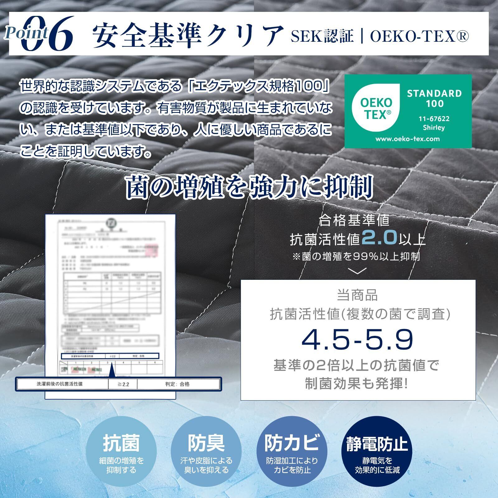 【OEKO-TEX認証素材・SEK認証・抗菌防臭安心ベッド敷パット】このシーツパッドは、350種類以上の有害化学物質を対象とした厳格な分析試験をクリアした製品にのみ与えられる、世界最高水準の安全な繊維製品の証です。製品クラスにおいては、規制値の基準が厳しい「Class II(※)」を取得しております。試験データによれば、pH値は約6の弱酸性であり、抗ダニ性能抑制率は97.39%、さらに、黄色ブドウ球菌、カンジダ・アルビカンス、大腸菌の不活性化率は98%以上であることが明らかにされています。高い安全基準を満たしており、安心してご使用いただけます。