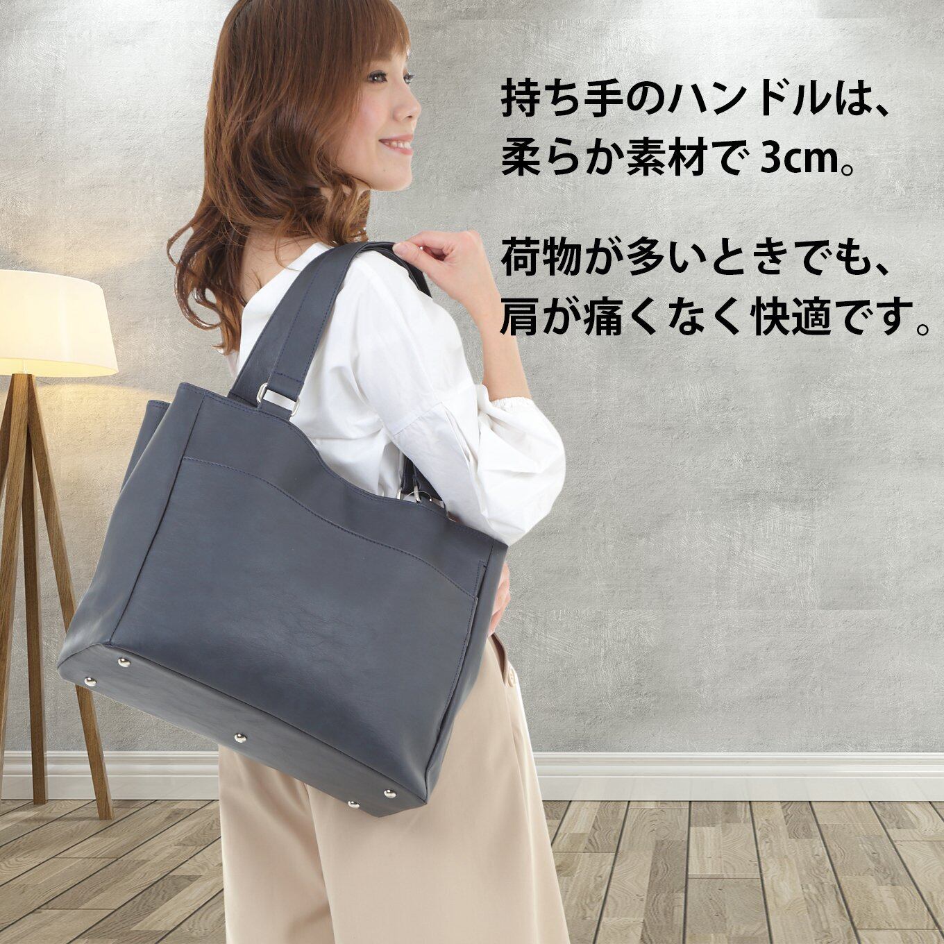 持ち手は敢えて幅広に。重たい荷物のときも、肩に食い込まず疲れません。 大きめのアーチで冬の厚着の時でも楽に肩にかけることができます。男性でも肩にかけてご使用いただけるデザインです。 落ち着いたファスナーとファスナー周りのアクセントは、カジュアル過ぎず落ち着いた雰囲気で、ビジネス、プライベート、小旅行などあらゆるシーンで使用できます。