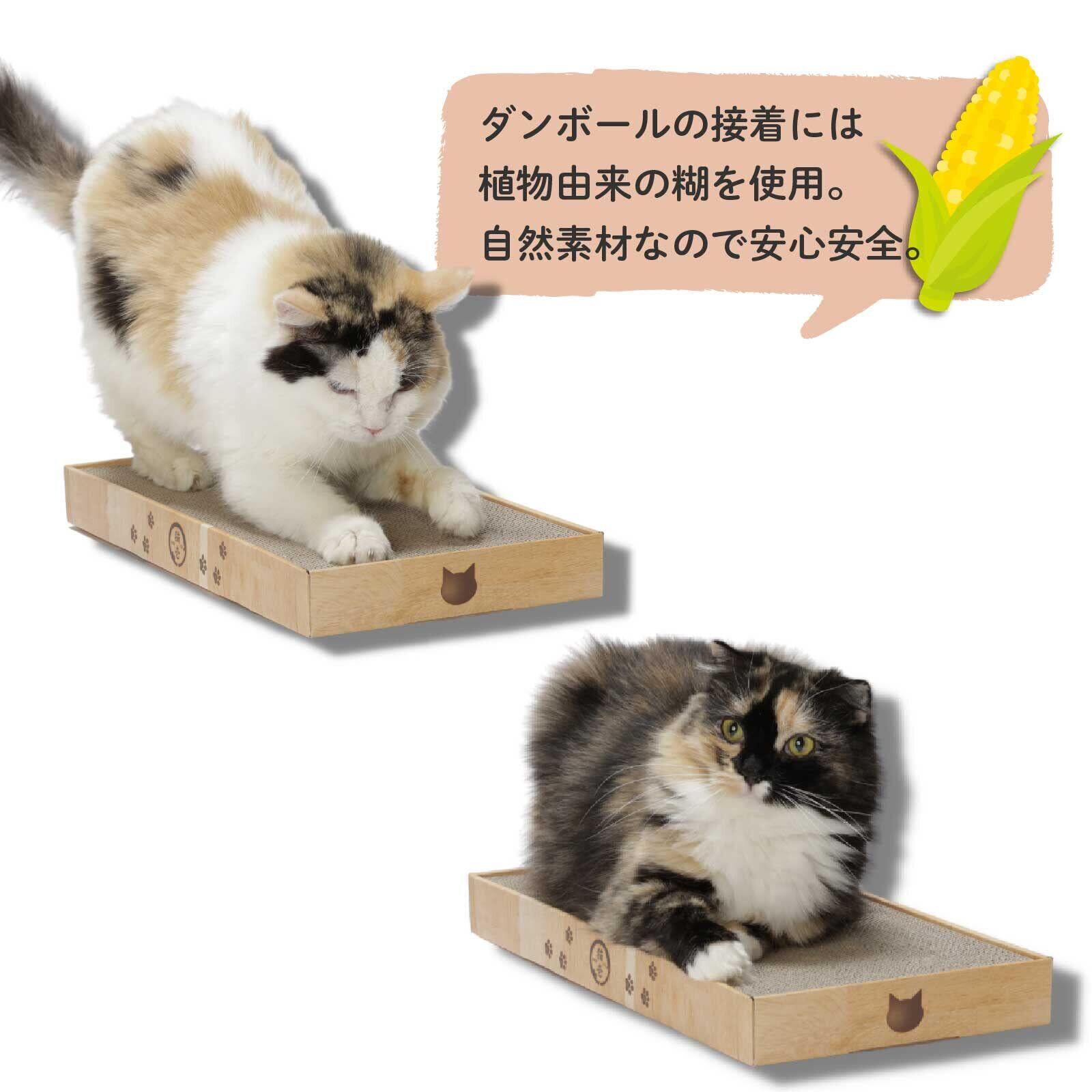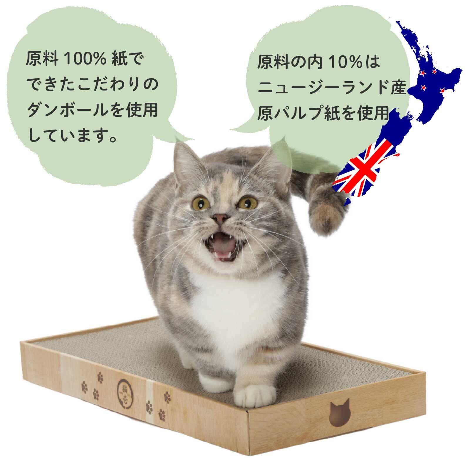 【こだわり抜いた原材料】つめとぎ部分に使用しているダンボールは、原料の100%が紙。 内10%はニュージーランド産原パルプ紙を使用。大切な猫に使用するつめとぎなので、品質にはとことんこだわりました。 ダンボールを貼り合わせる糊は植物由来の糊を使用しています。