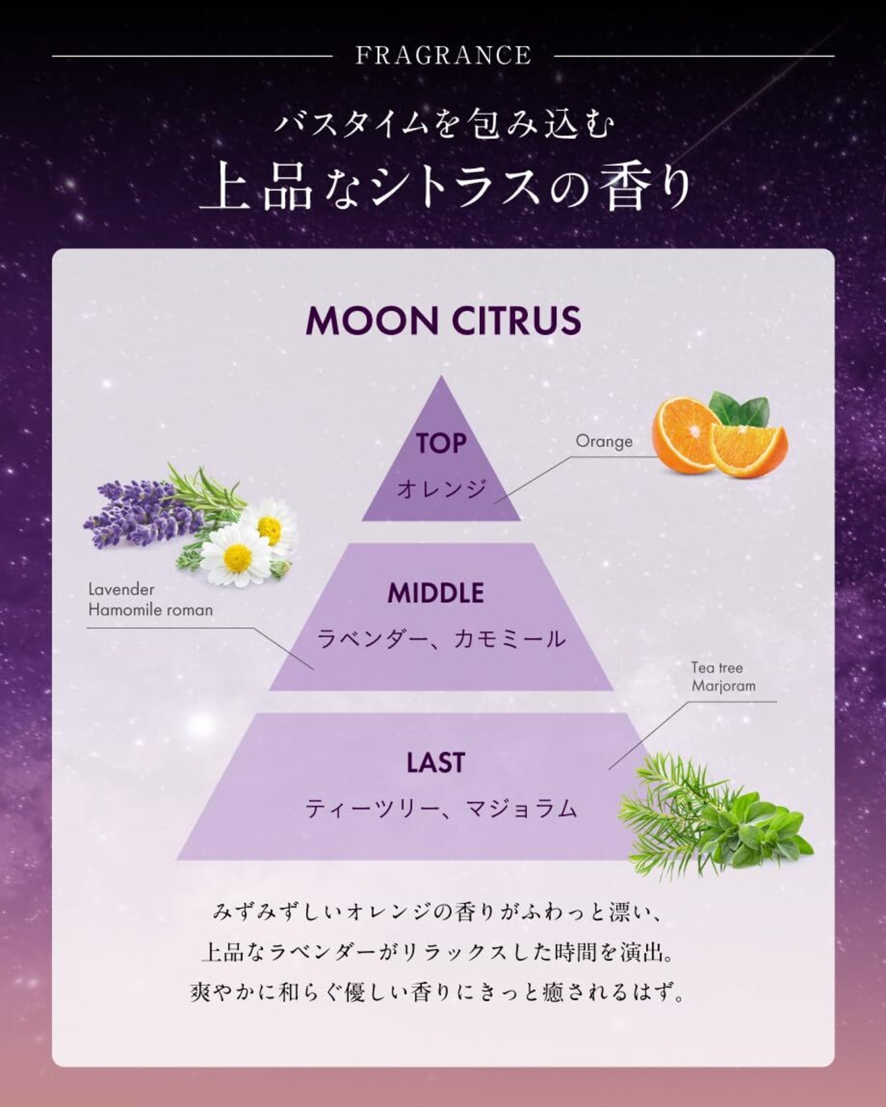 [ ムーンシトラスの香り ] 1日中続く上品なシトラスの香りを採用。リラックス効果のある香りが、毎日のバスタイムを心地よい甘美なひと時にします。