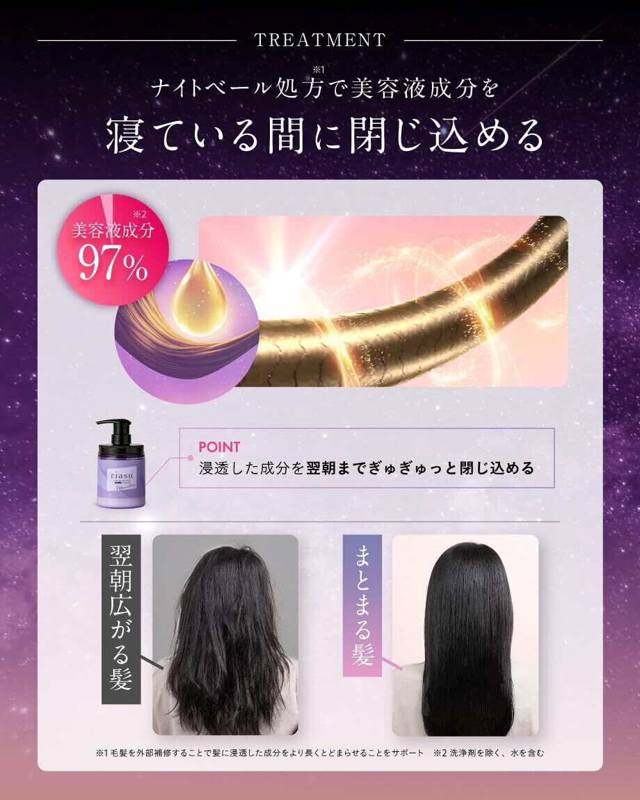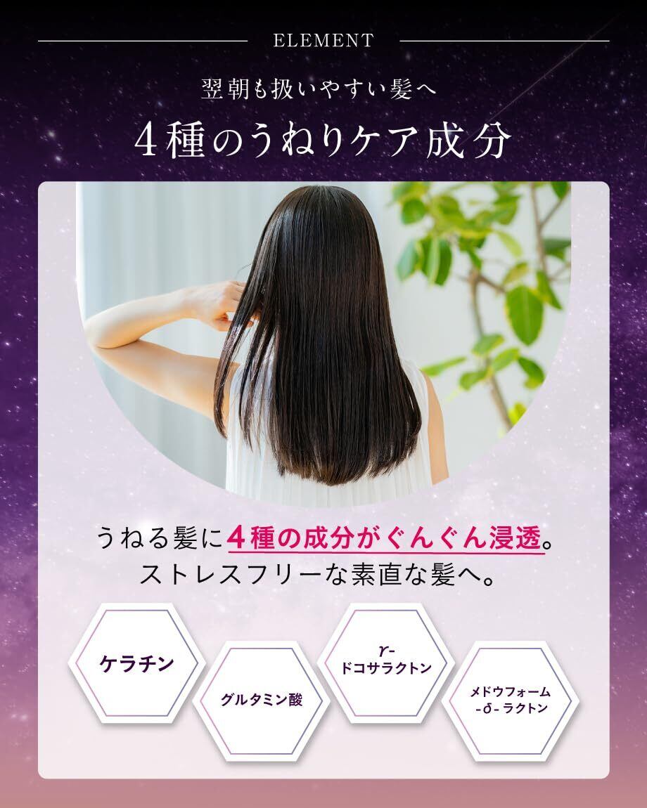 [ 翌朝、驚くほどのまとまりとツヤ ]髪に浸透する独自成分と、うるおいを閉じ込めるコーティング成分が睡眠中の摩擦やホコリなどのあらゆるダメージをブロック!翌朝余裕が生まれるまとまり髪に。