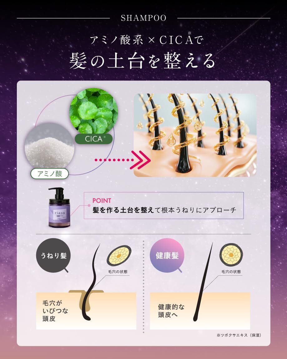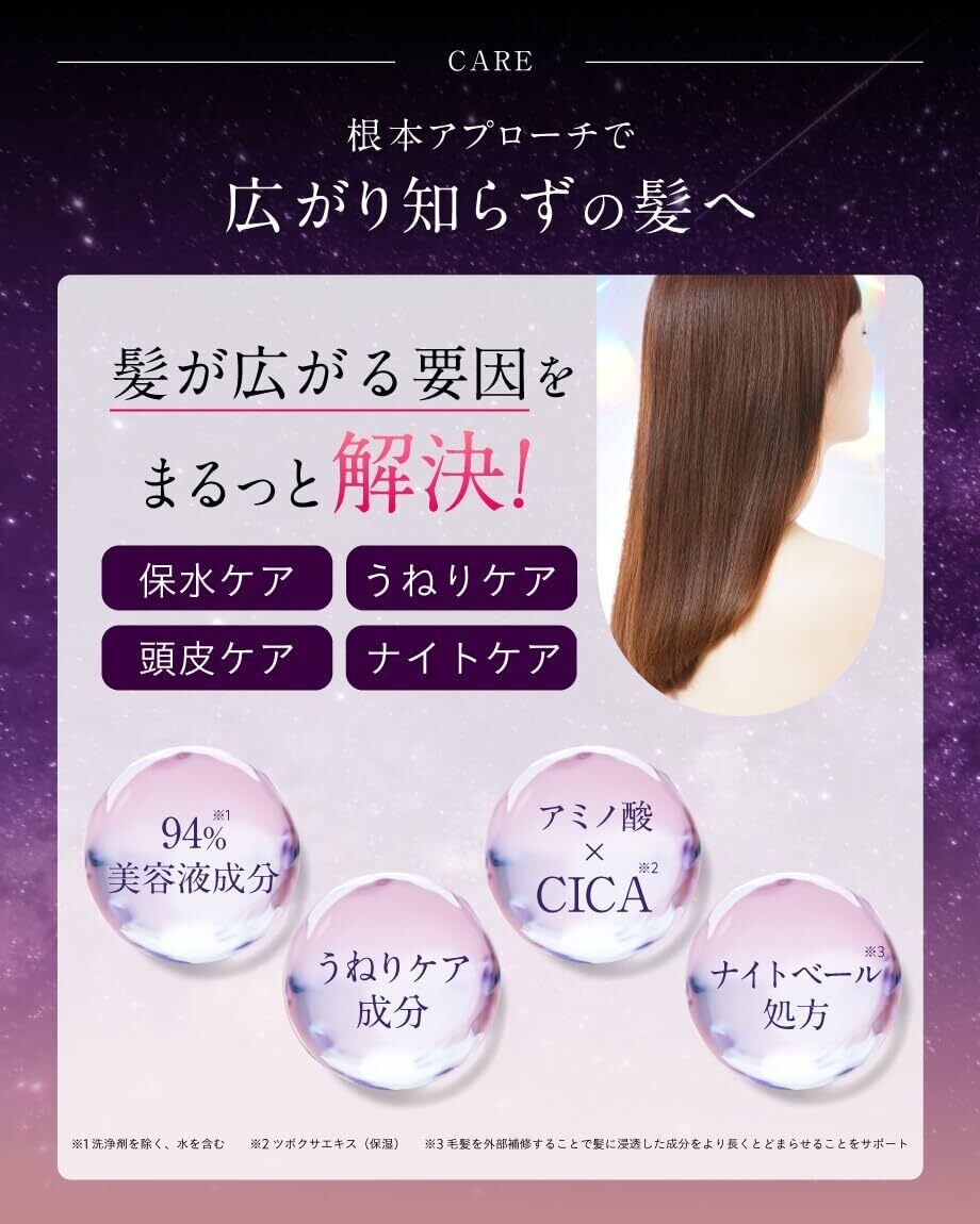 [ CICA配合でバージョンアップ! ]新たに独自処方のCICA成分を配合。わずか1nmのCICAカプセルがゆっくりと溶けて頭皮と髪の奥深くに浸透し、髪の保湿と頭皮のWケアを実現!翌朝のまとまり髪効果がさらに実感しやすくなりました。