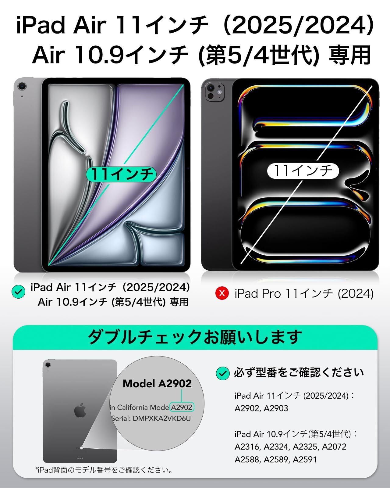 【互換性】:iPad Air 11インチ(2025/2024)、iPad Air 第5/4世代(2022/2020)専用です。モデル:A2902、A2903、A2316、A2324、A2325、A2072、A2588、A2589、A2591,他のiPadモデルと互換性がありません