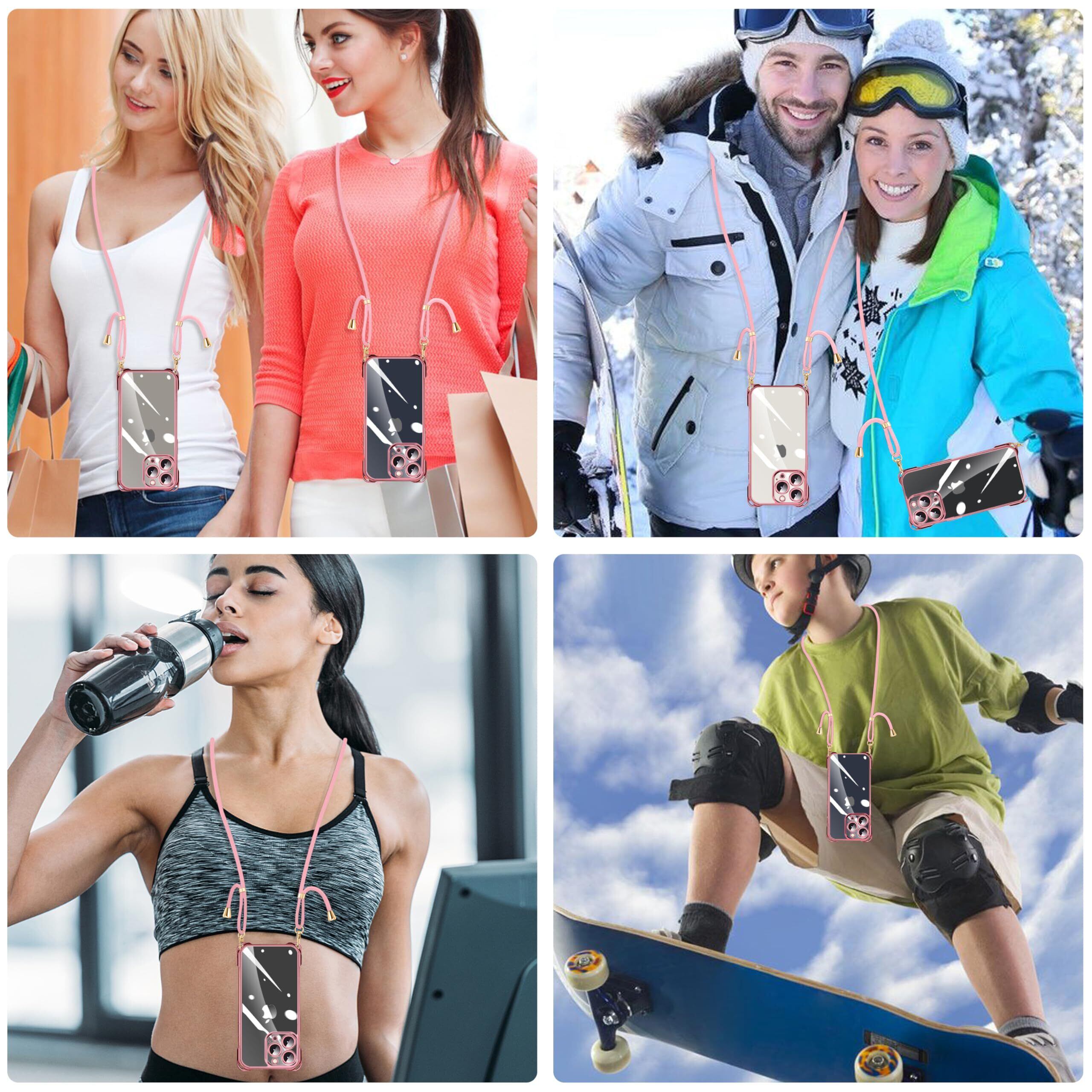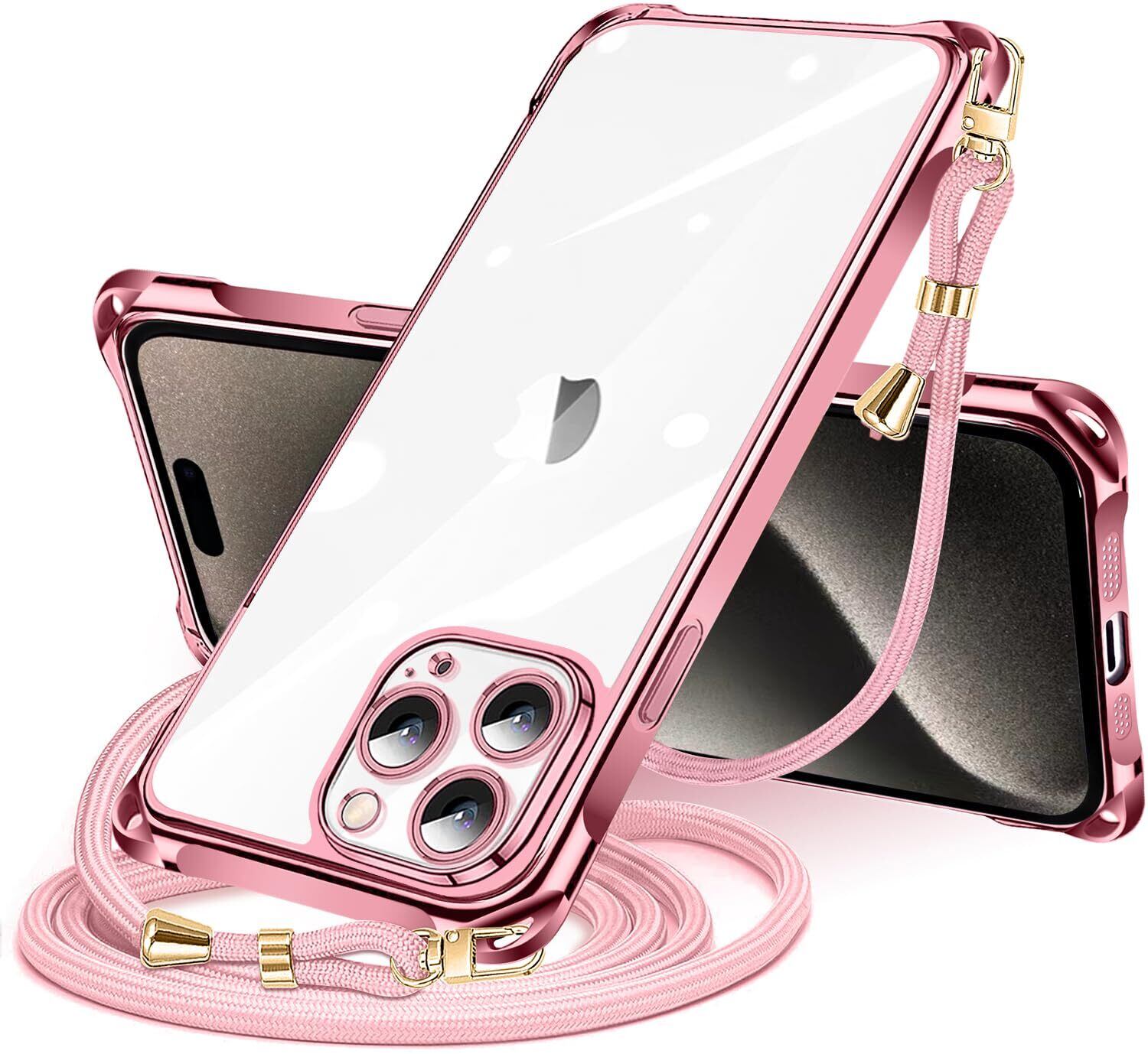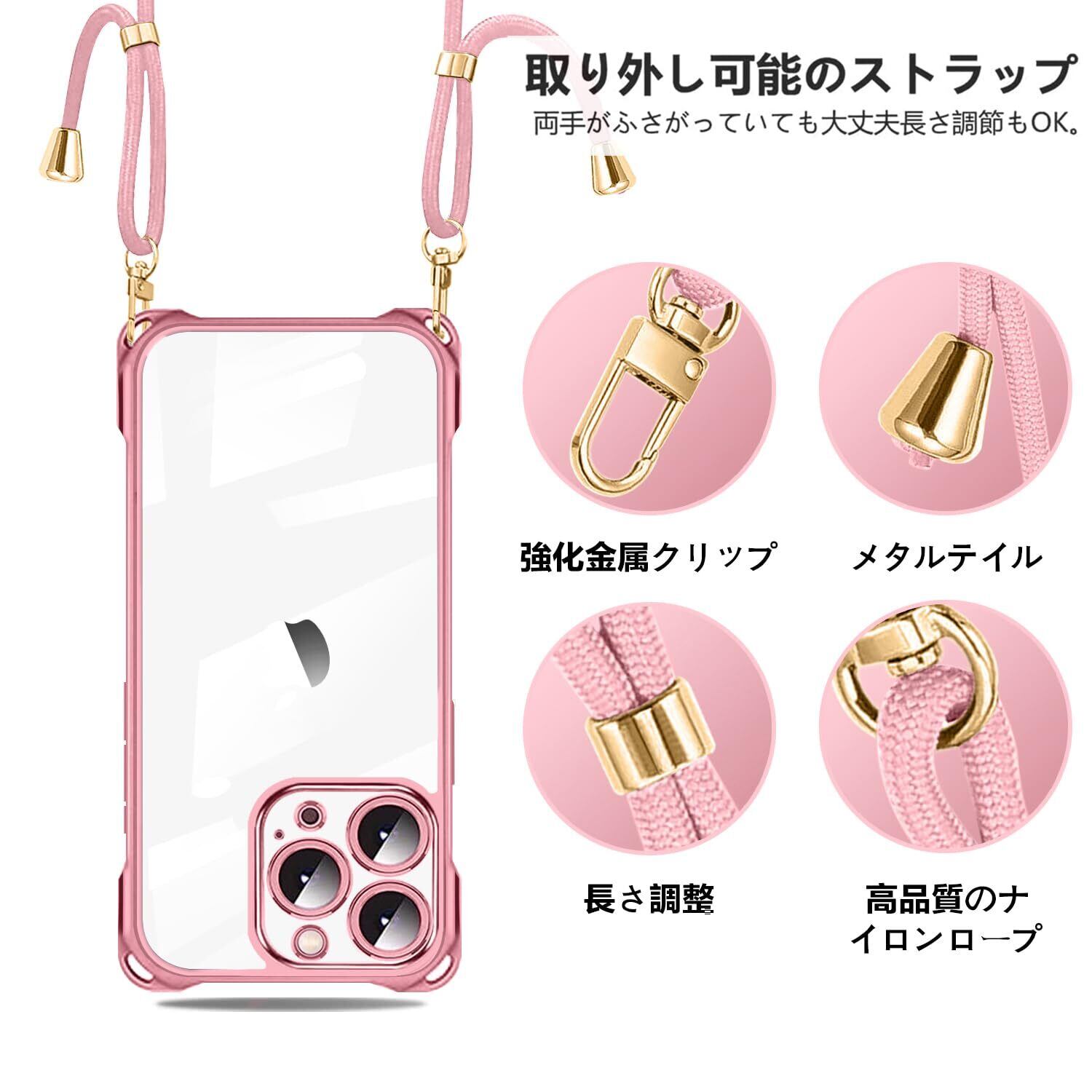 NISIILNG iPhone 15 Pro Max 用 ケース クリア ショルダー iPhone15promax スマホケース アイフォン15ProMax カバー 肩掛け 斜めかけ 縄掛け 透明 薄型 軽量 耐衝撃 TPU ストラップ付き 紐付き 斜めがけ 織りストラップ付き ネックストラップ ショルダー 縦/横 2WAY 長さ調整可能 取り外し可能 落下防止 紛失防止 (ローズゴールド)