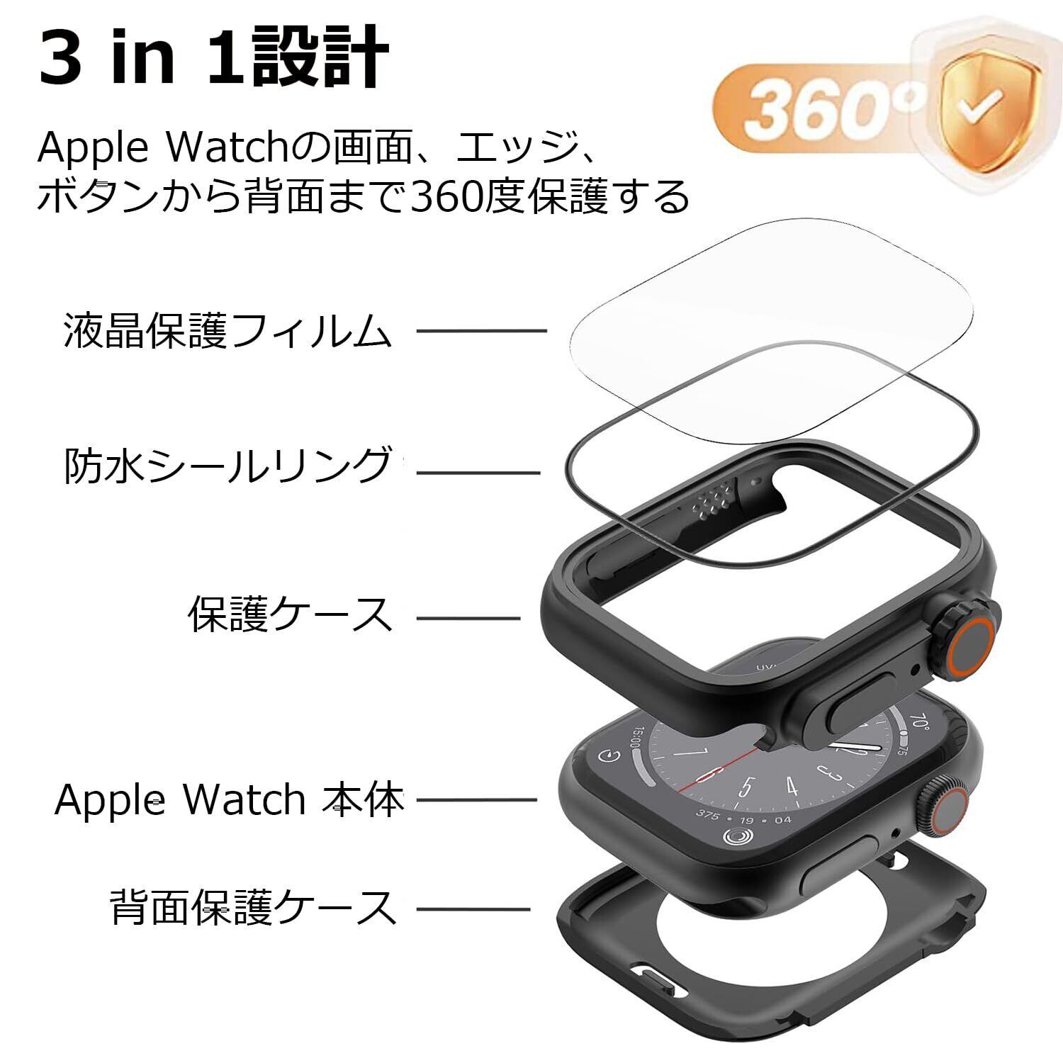 「液晶保護フィルム+保護ケース+背面保護ケースの3 in 1設計」本製品は、Apple Watchの画面、エッジ、ボタンから背面まで360度保護する、Apple Watchケース/フィルム一体型の保護ケース+背面保護ケースの3つの合体設計です。9H硬度の強化ガラスフィルムは、キズに強く耐久性があり、高解像度で高透過率、タッチもスムーズです。PC素材の保護ケースは、落下やキズなどからあなたのApple Watchを保護し、新品の状態を長持ちさせます。