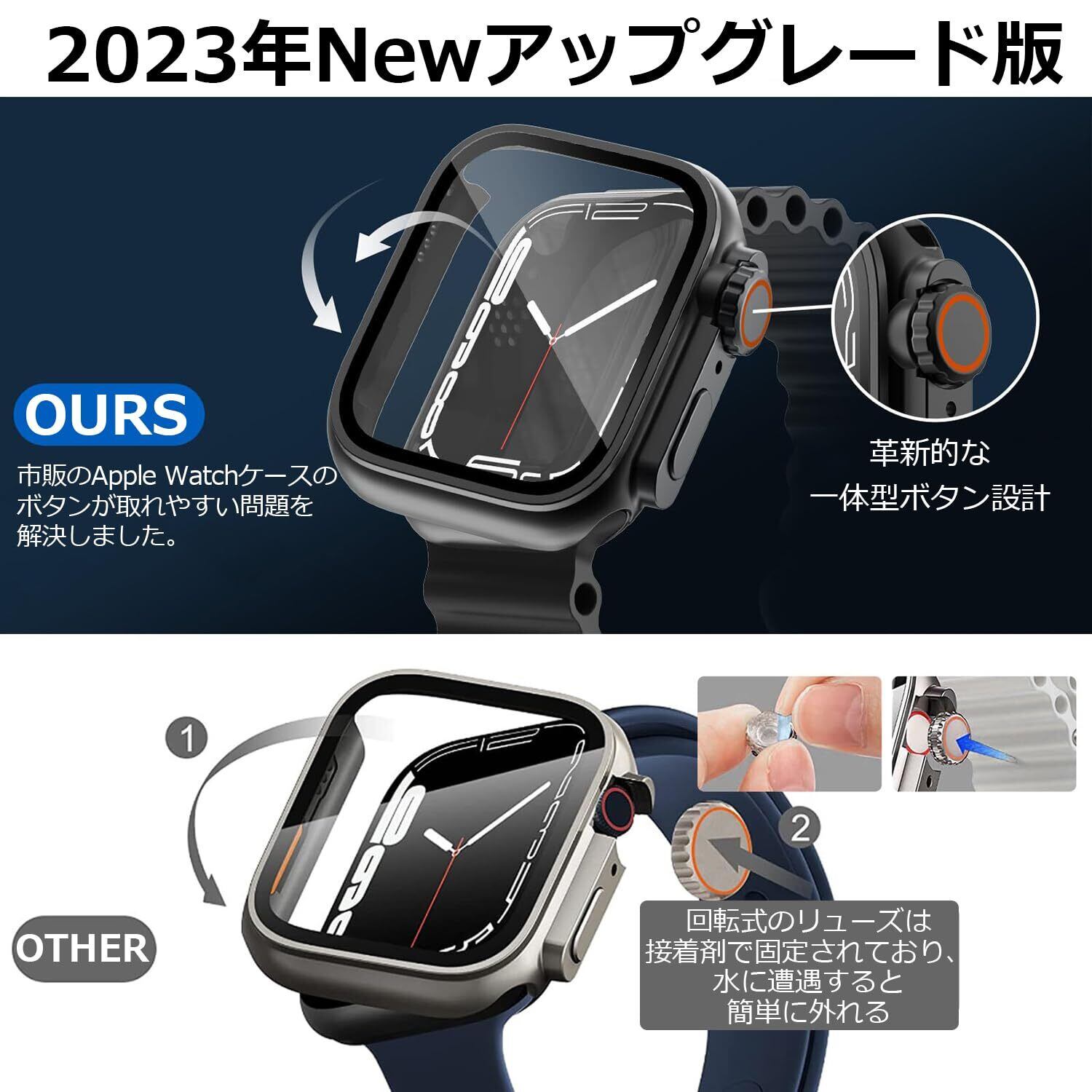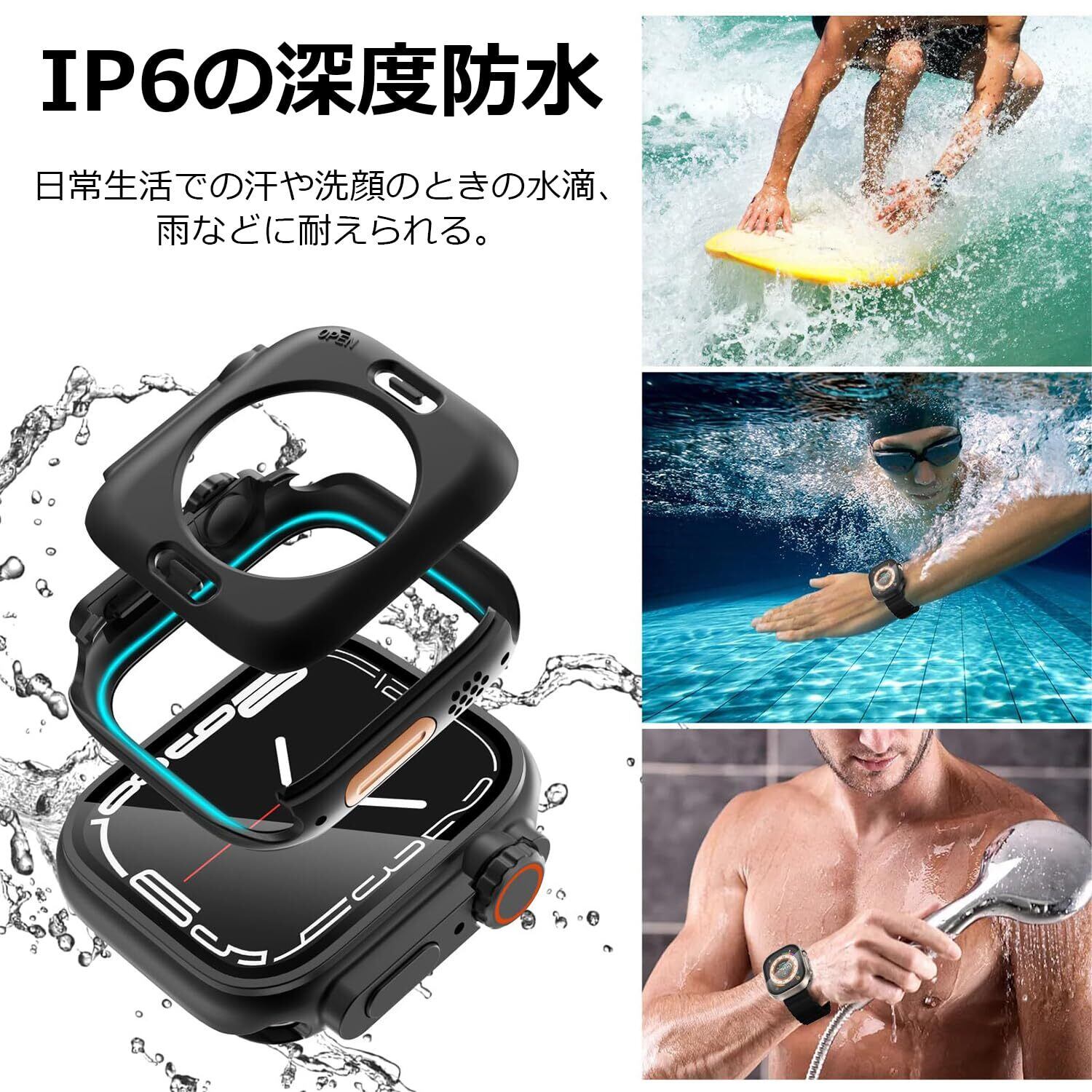 「一体型防水設計!」2023年Newアップグレード版。革新的な一体型ボタン設計で、市販のApple Watchケースのボタンが取れやすい問題を解決しました。IP6の深度防水で、Apple Watchを付けたままランニング、登山、キャンプなど、爽やかな汗をかきながら趣味度を思いっきり楽しむことができます。