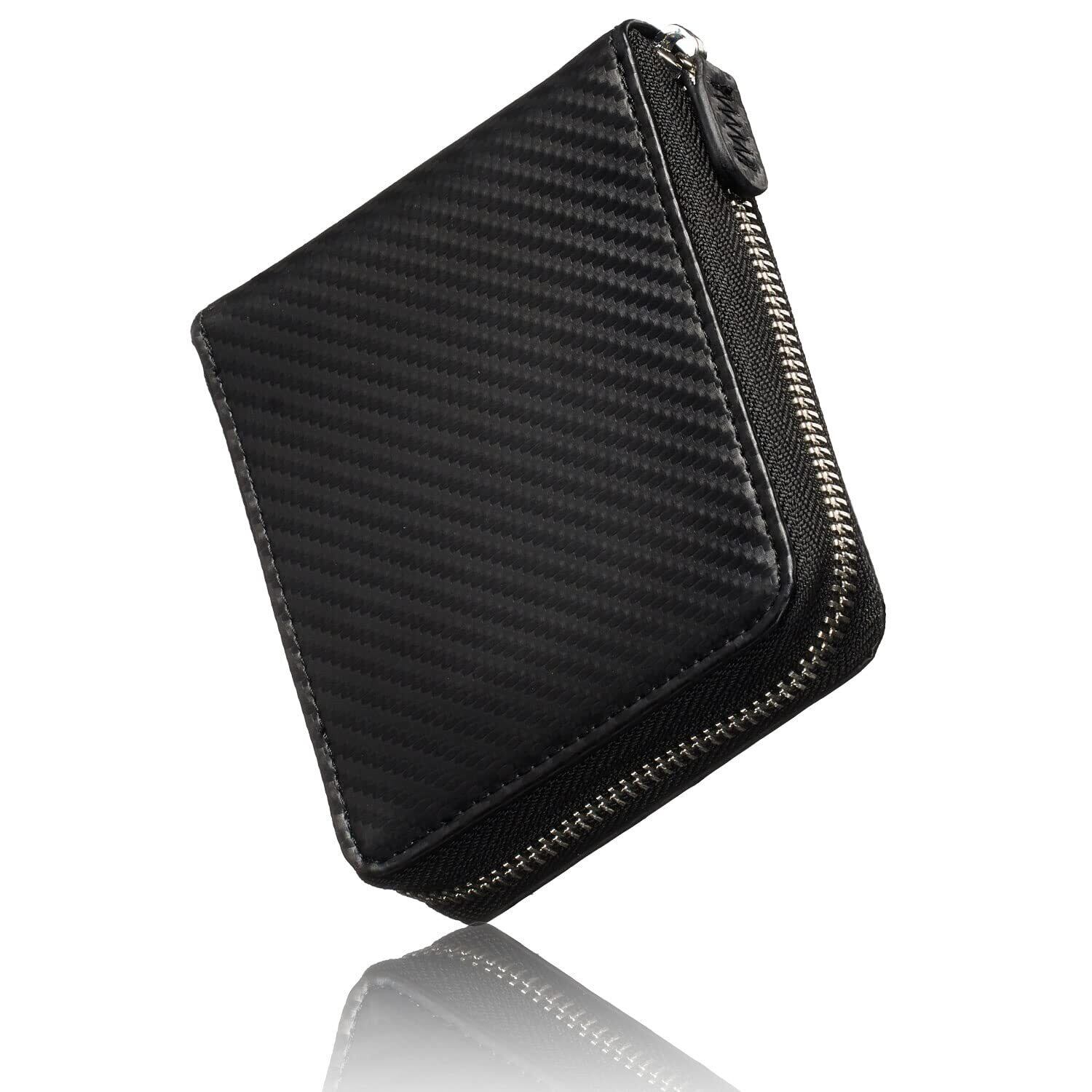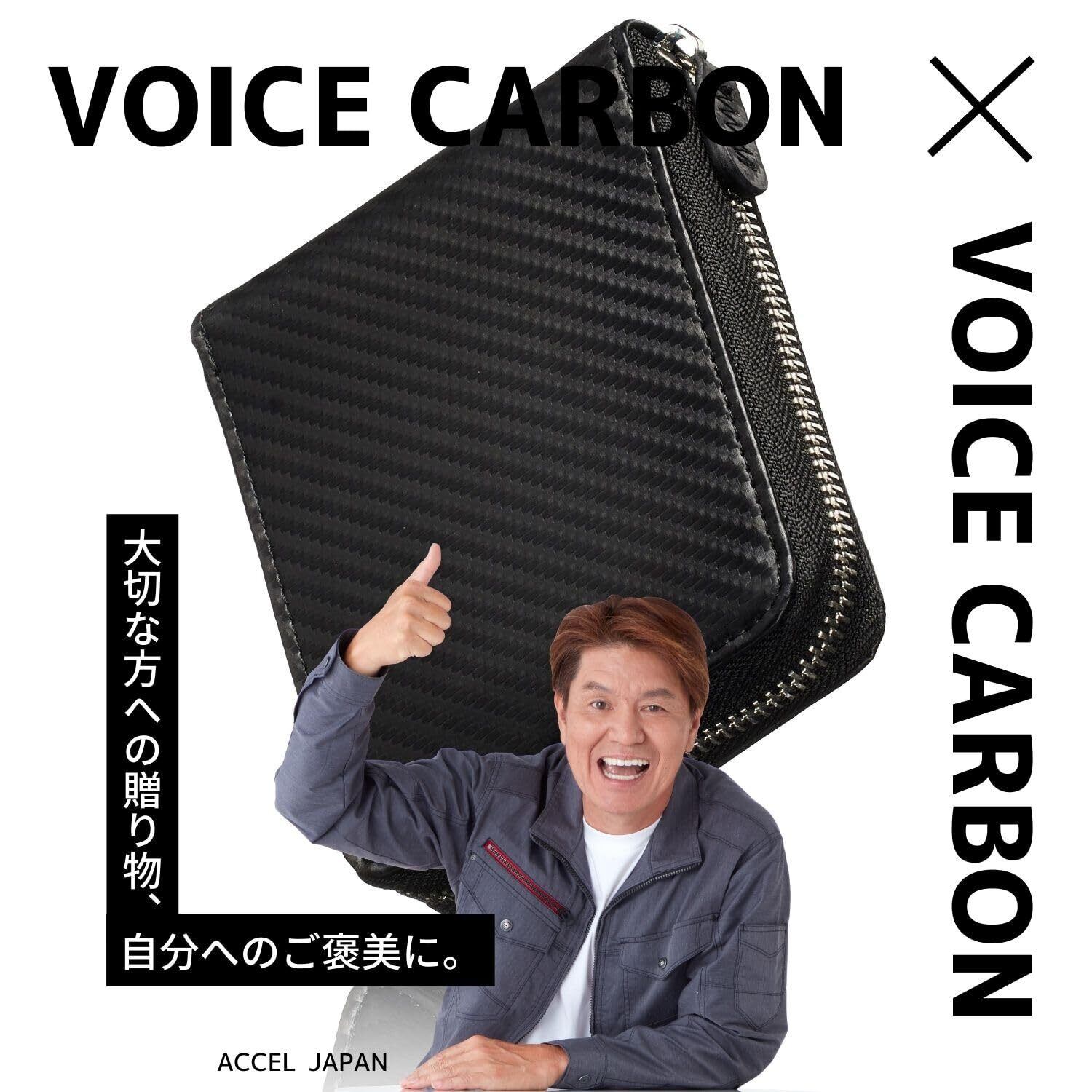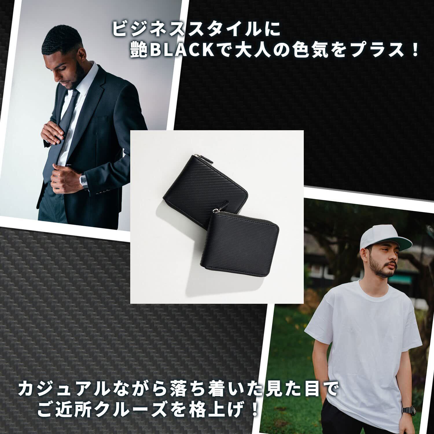 [VOICE] ヴォイス メンズ カーボンレザー 二つ折り 財布 『技あり』厚くならない ラウンドファスナー 使いやすい BOX型小銭入 プレゼント 用 ギフト 箱入り (Black/Black)