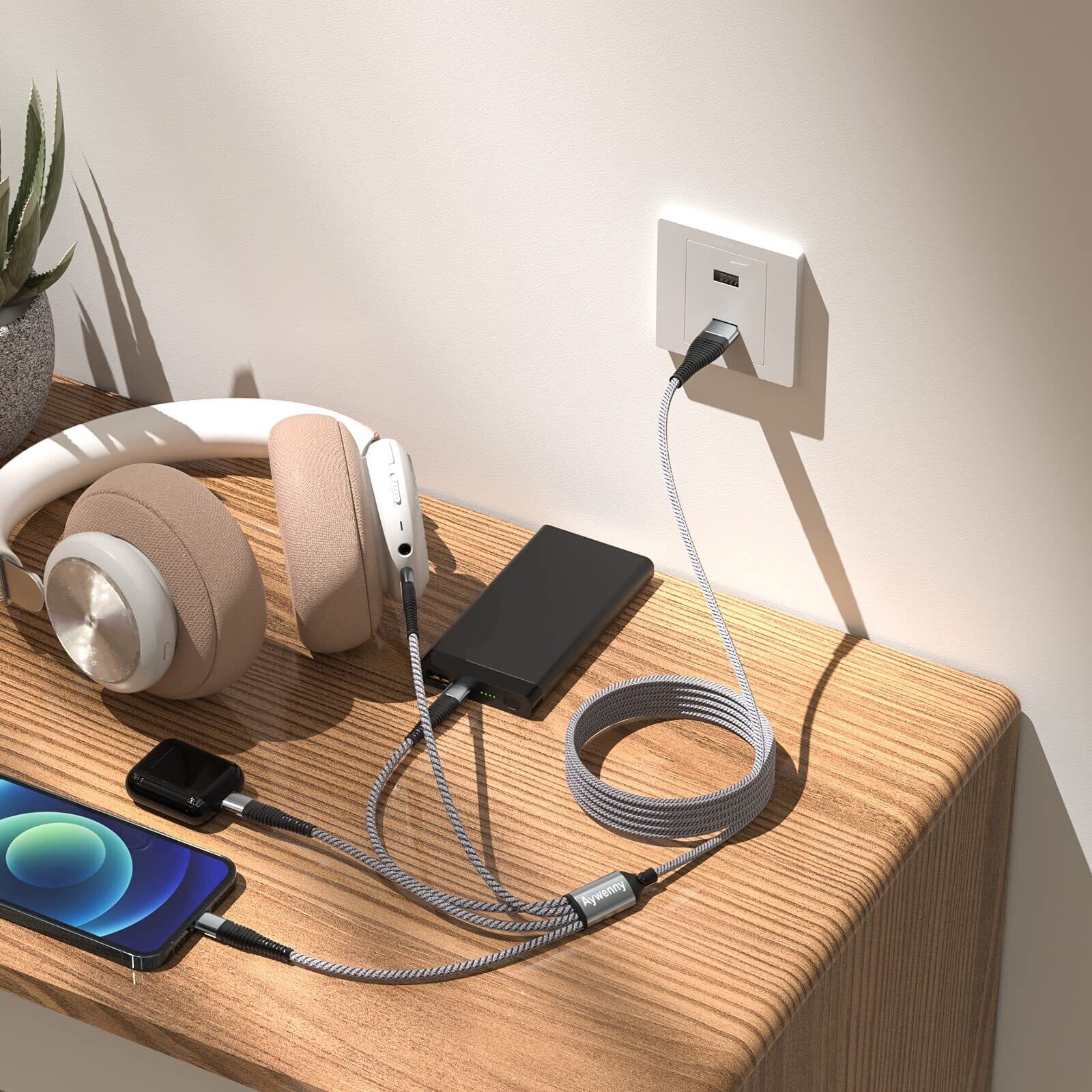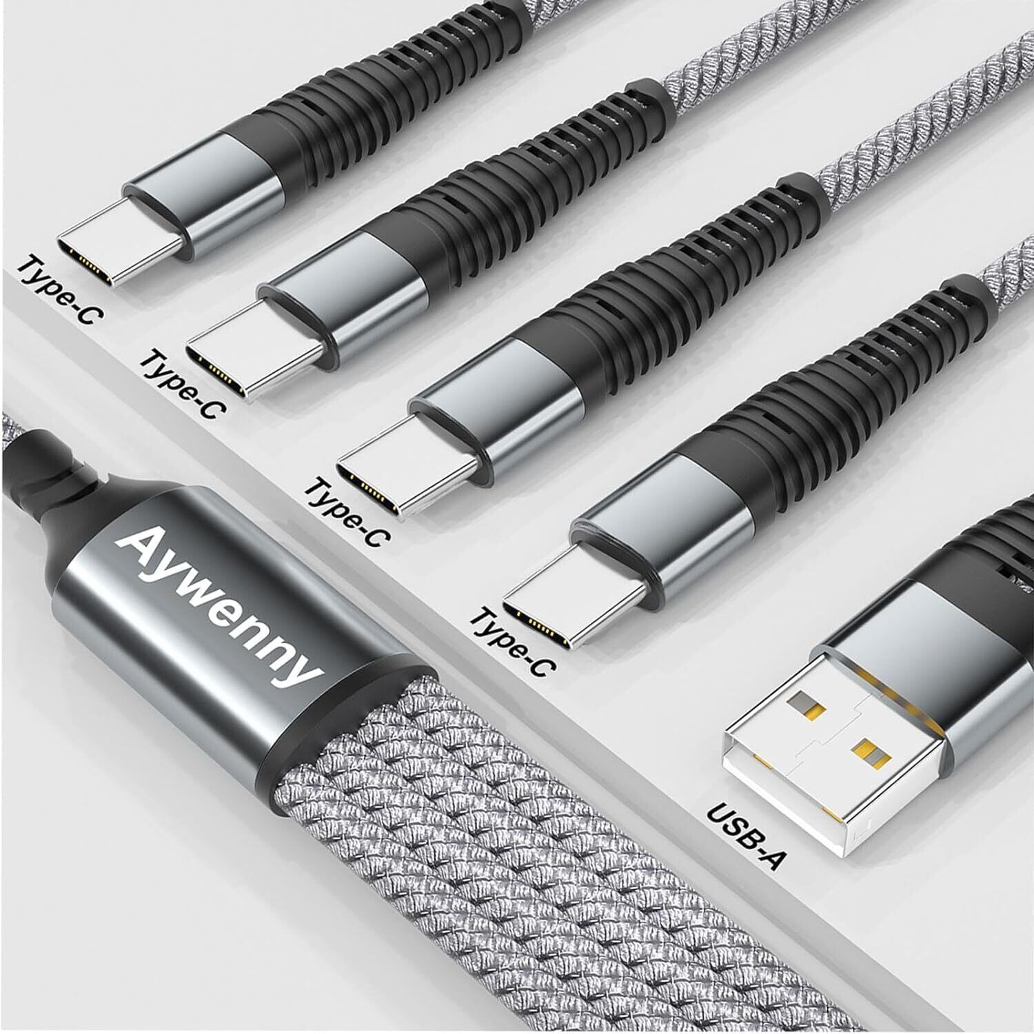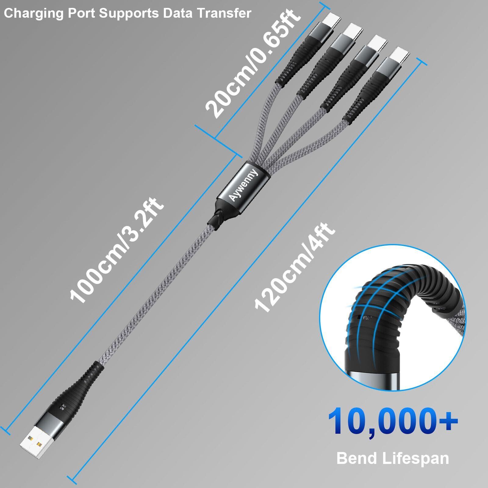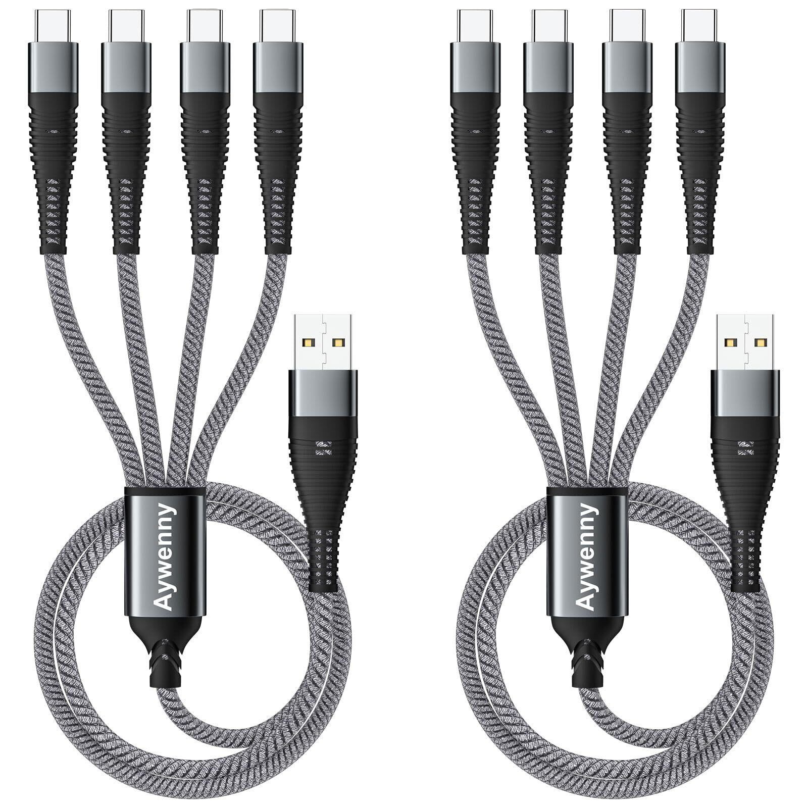 【2本セット】 4 in 1高耐久編組ナイロン多機能充電ケーブル、USB急速充電ケーブル、4種類のインターフェースTypeC*4 を持ち、4台の設備の同時充電をサポートしPhone17 16 15/Switch/Google Pixel/Nexus5 X6P/Samsung S8+/note8/Xperia,Galaxy/LG (灰)