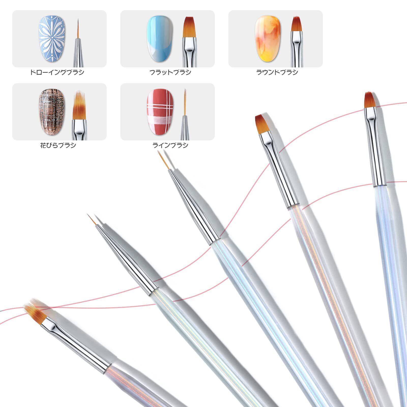 プロセット:プロ仕様のネイルブラシには、5種類のネイルデザインペンが付属しています。ネイルエクステンションジェルブラシ、ビルダージェルブラシ、ネイルカービングペン、ネイルアートライナーブラシ、ネイルドットペンなど。 自宅で簡単に美しいネイルアートを作ることができます