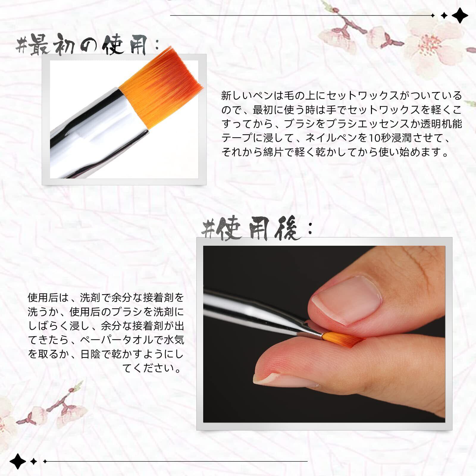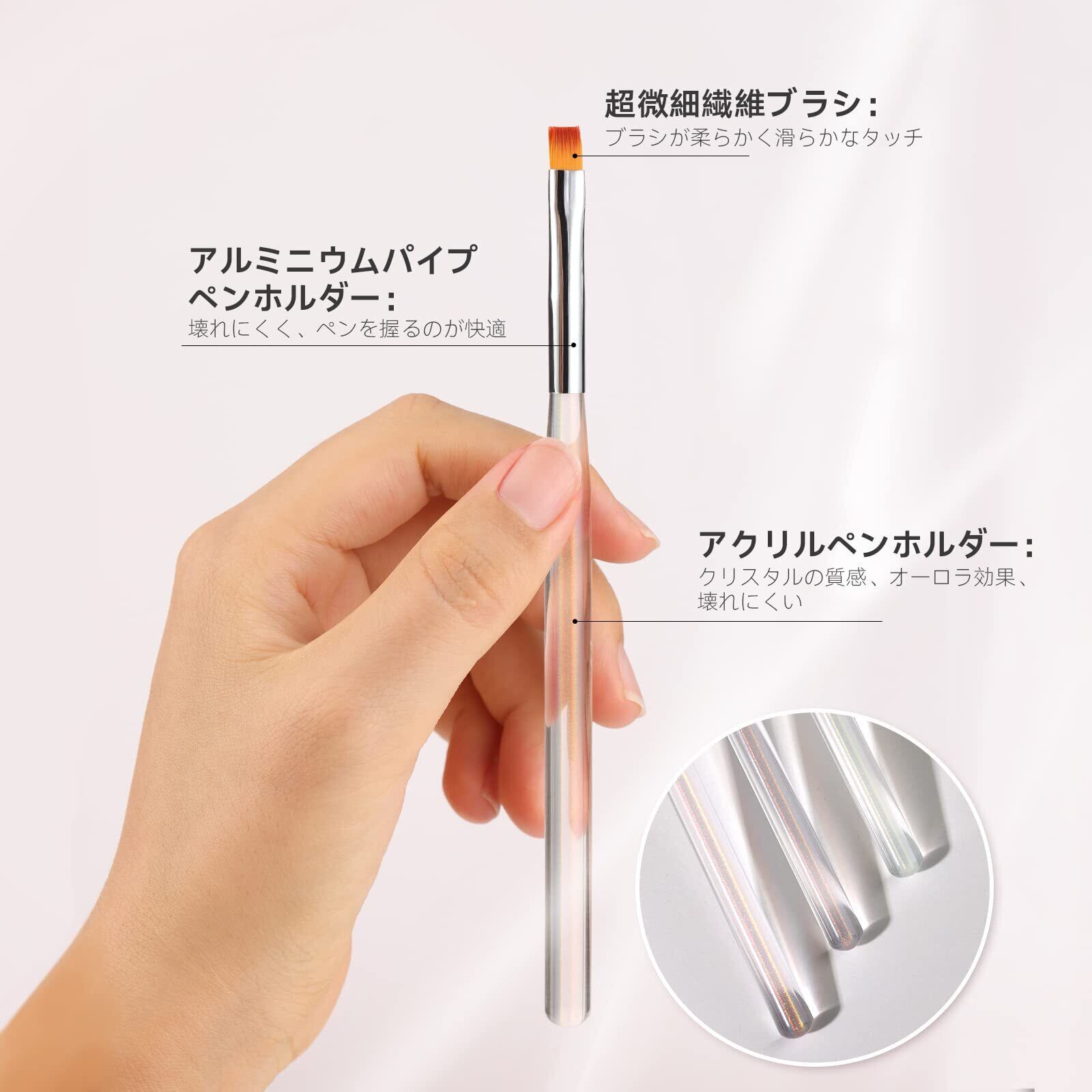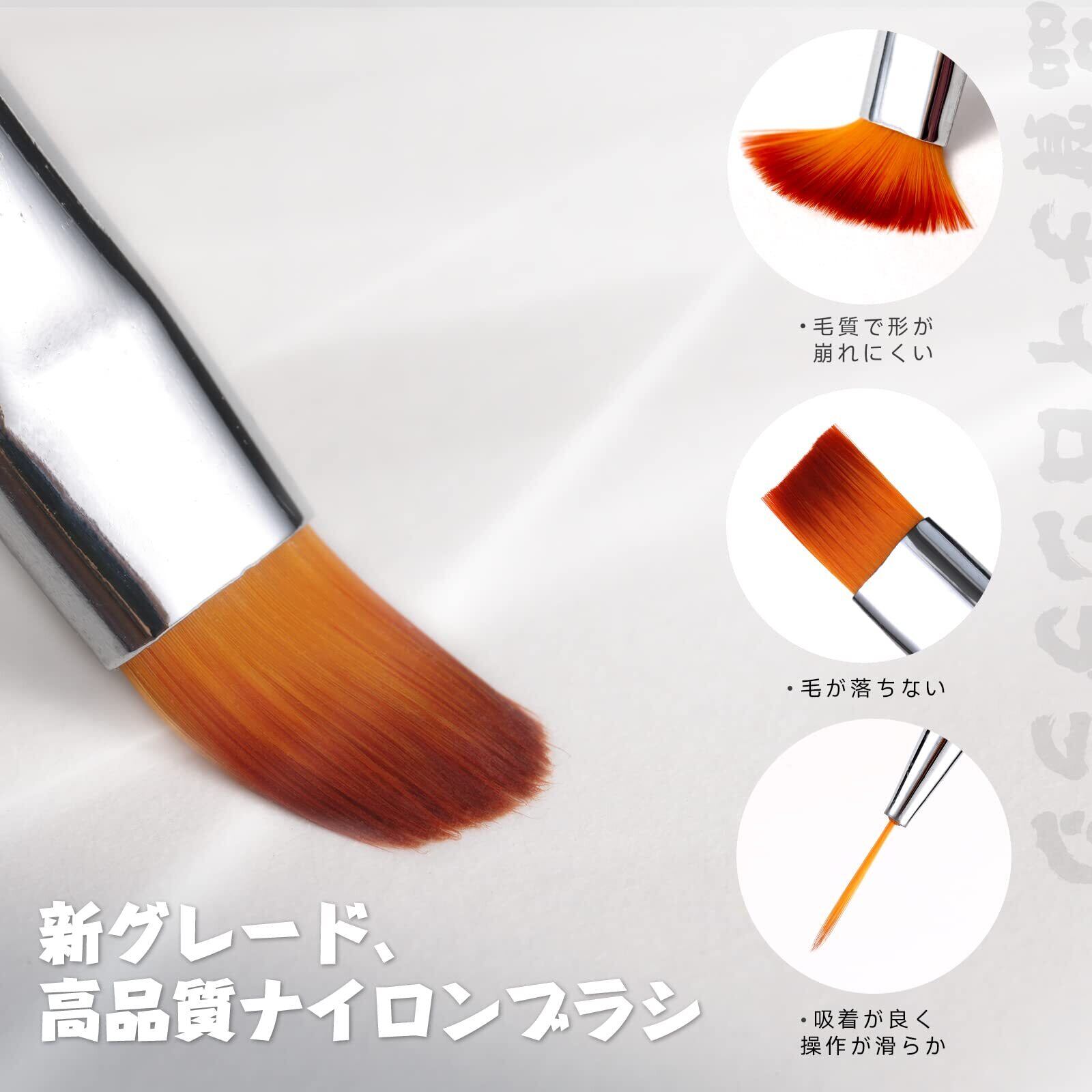 ネイルに適したナイロン繊維:ネイル向きに専門のナイロン繊維を選択、薄くてややハリ感があり、ナイルジェル、パウダーが付きやすい。柔らかく、粘りがありまとまりもよい毛質で、形が崩れにくい、折り曲げにも強く、誰でも手軽に本格的なネイルアートを楽しめる