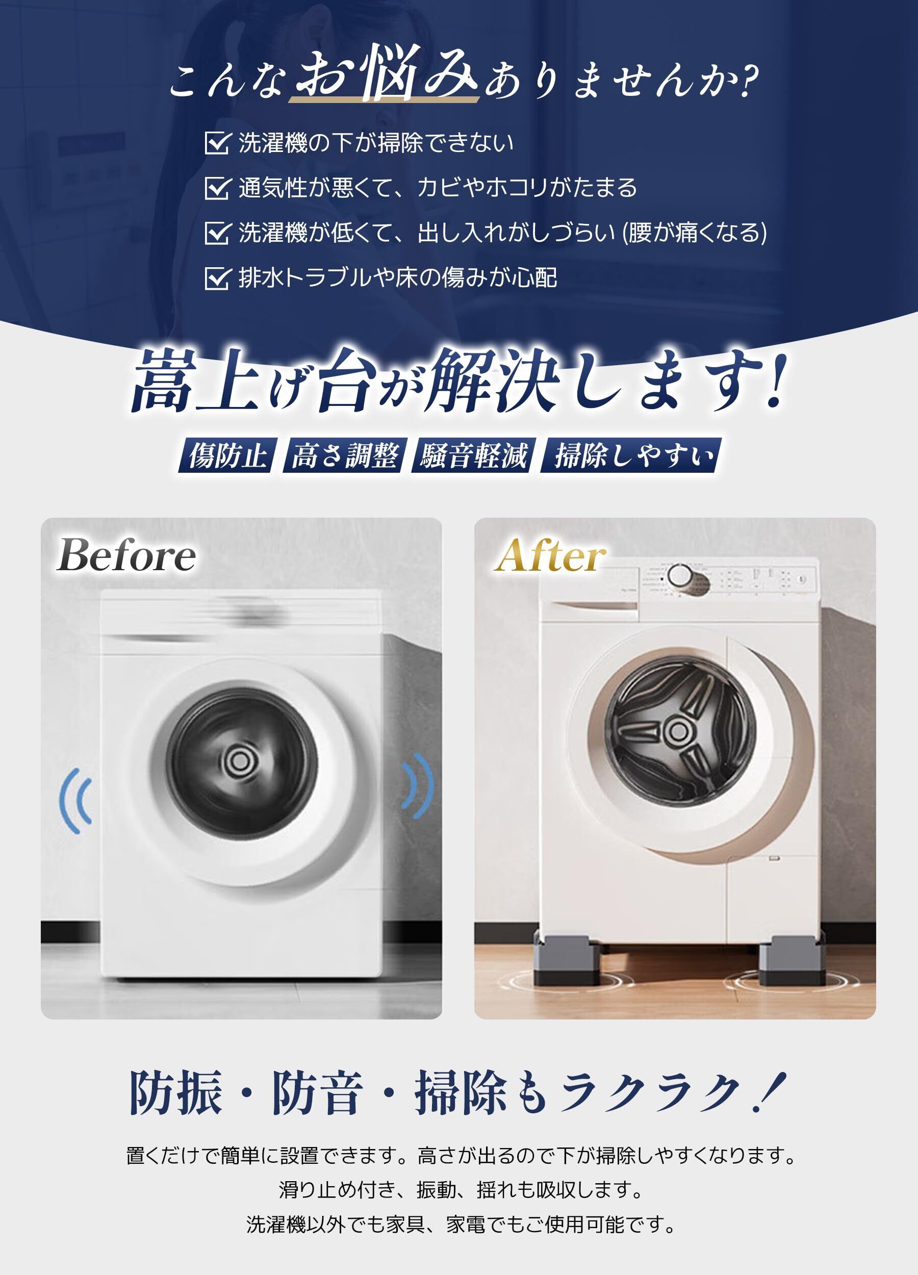 【取り付け簡単、防振、緩衝、防音に】地震による振動、衝撃、揺れを最小限的に抑え、転倒、ズレ、散乱を効果的に防ぐことができます。置くだけ簡単設置,接着不要で簡単に防振・防音効果が得られます。付属の静音パッドは、使用時にかさ上げ台の上に置くだけで、騒音を吸収するだけでなく、接触面の摩擦も効果的に減少し、洗濯机の足と家具の足をさらに保護します。