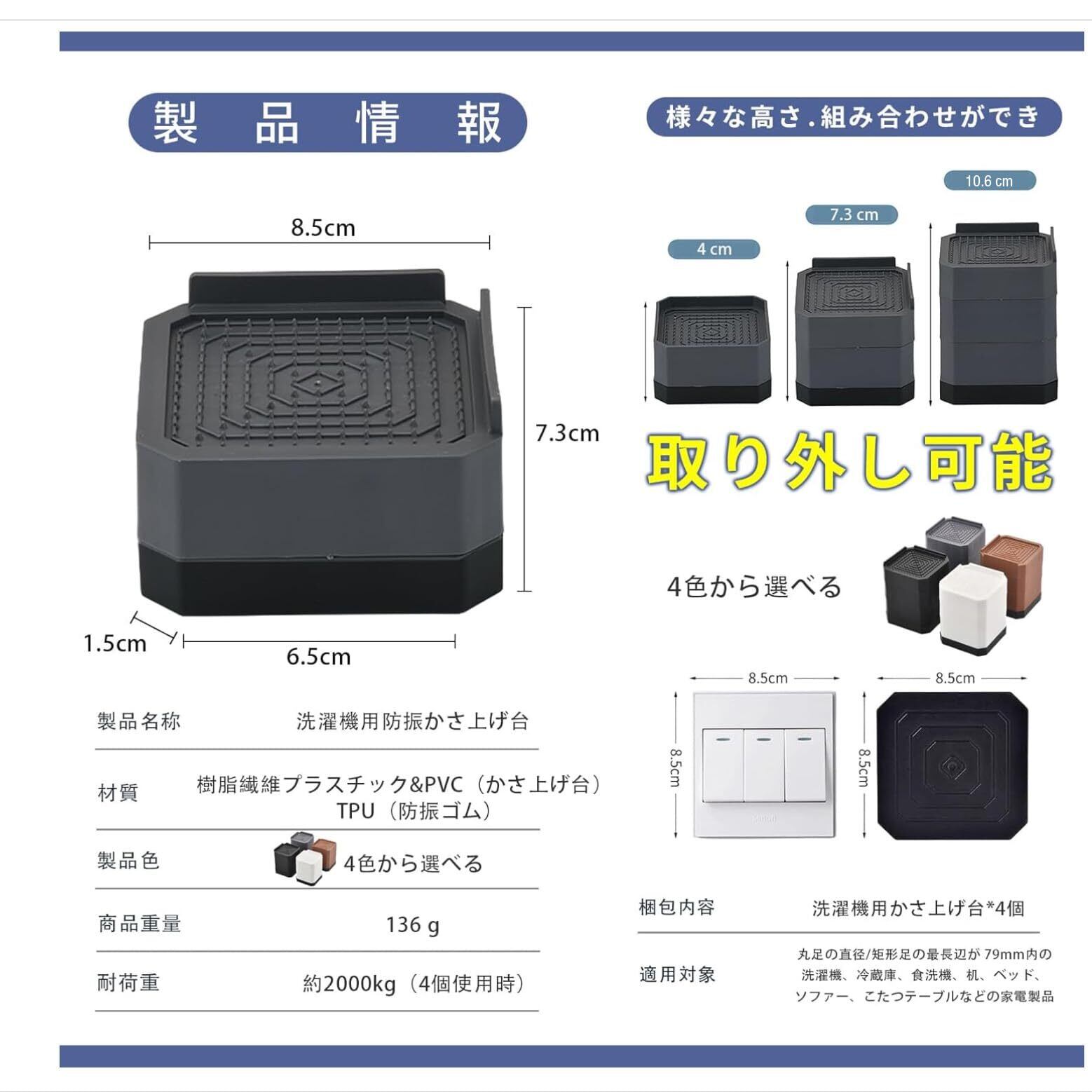 【洗濯機かさ上げ台】 サイズ:8.5L x 8.5W x 7.3H cm(2層)。セット内容:4個入り。耐荷重:約2000kg(4個使用時)。※適用対象:丸足の直径/矩形足の最長辺が79mm内の洗濯機、冷蔵庫、食洗機、机、ベッド、ソファー、こたつテーブルなどの家電製品・家具(85cm以上はつなぎ合わせる必要があります)。