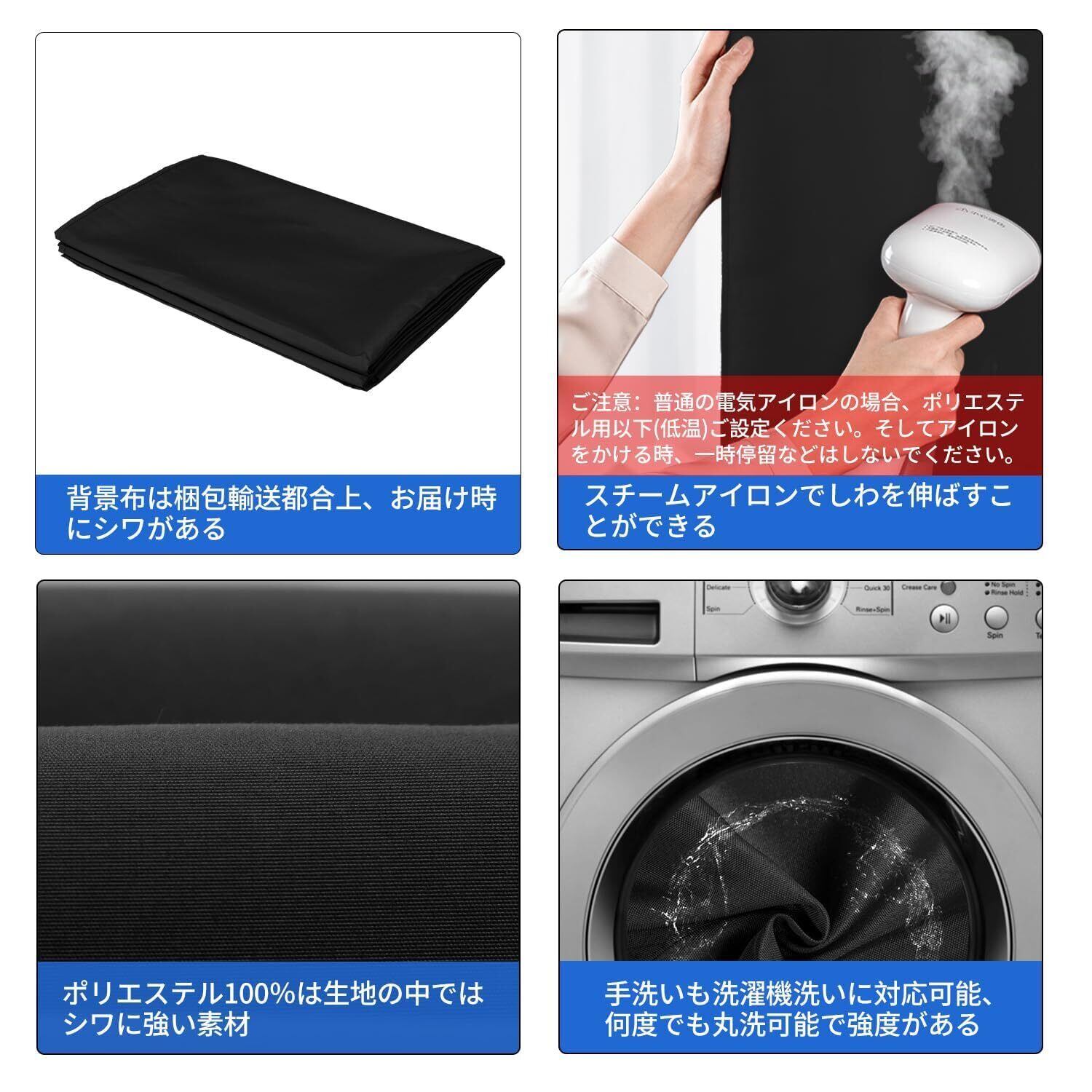 【使用便利な背景布】黒い布の幅は約150㎝、縦は約200㎝の大きいサイズのため、背景布は折り畳んでお届けることになり、折り目があります。ですが、スチームアイロンをかけてしわが取れます。 「ご注意:」普通の電気アイロンを使う場合、ポリエステル専用モード(低温)に設定する必要があります。それに、一時停留等はしないでください。スチームアイロンなら、安心にご使用ください。