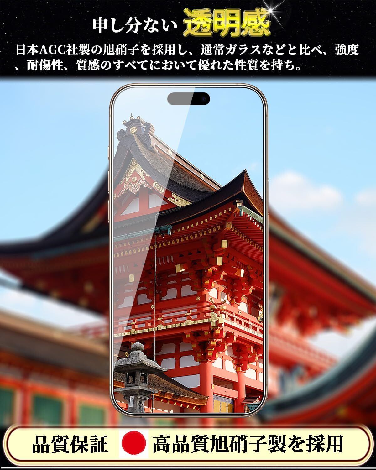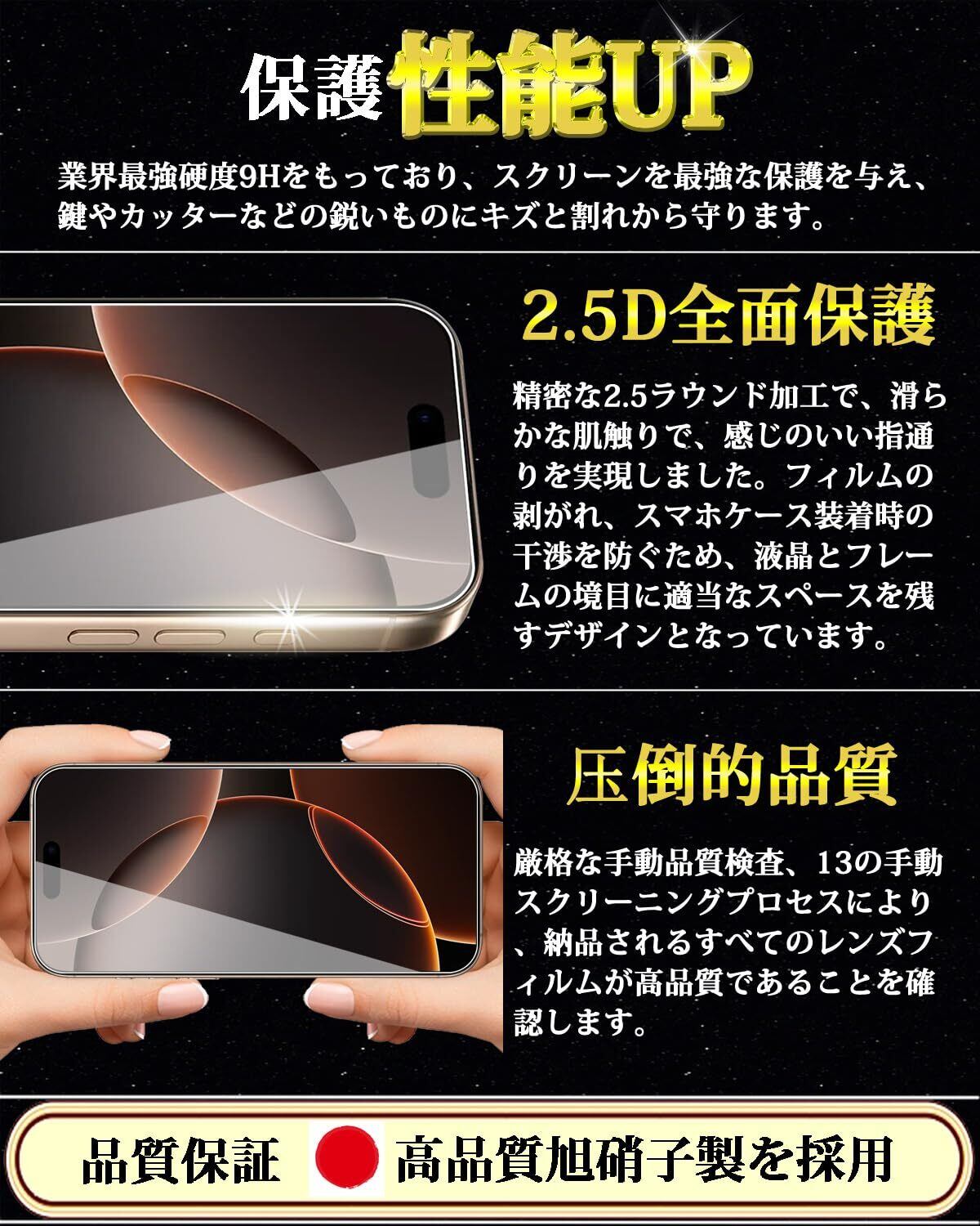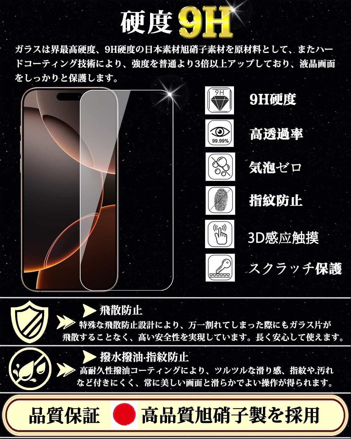 【旭硝子素材採用!対応機種】iPhone 16 Pro ガラスフィルム。日本製素材旭硝子製を採用しております、高品質な素材で衝撃を緩和し画面の破損を最低限まで抑えます。高品質製品の製作プロセスに厳しく基づき、ガラス420°高温強化時間6時間、め七つのステップを経てスマホに完璧的にフィットした製品を製造されます。