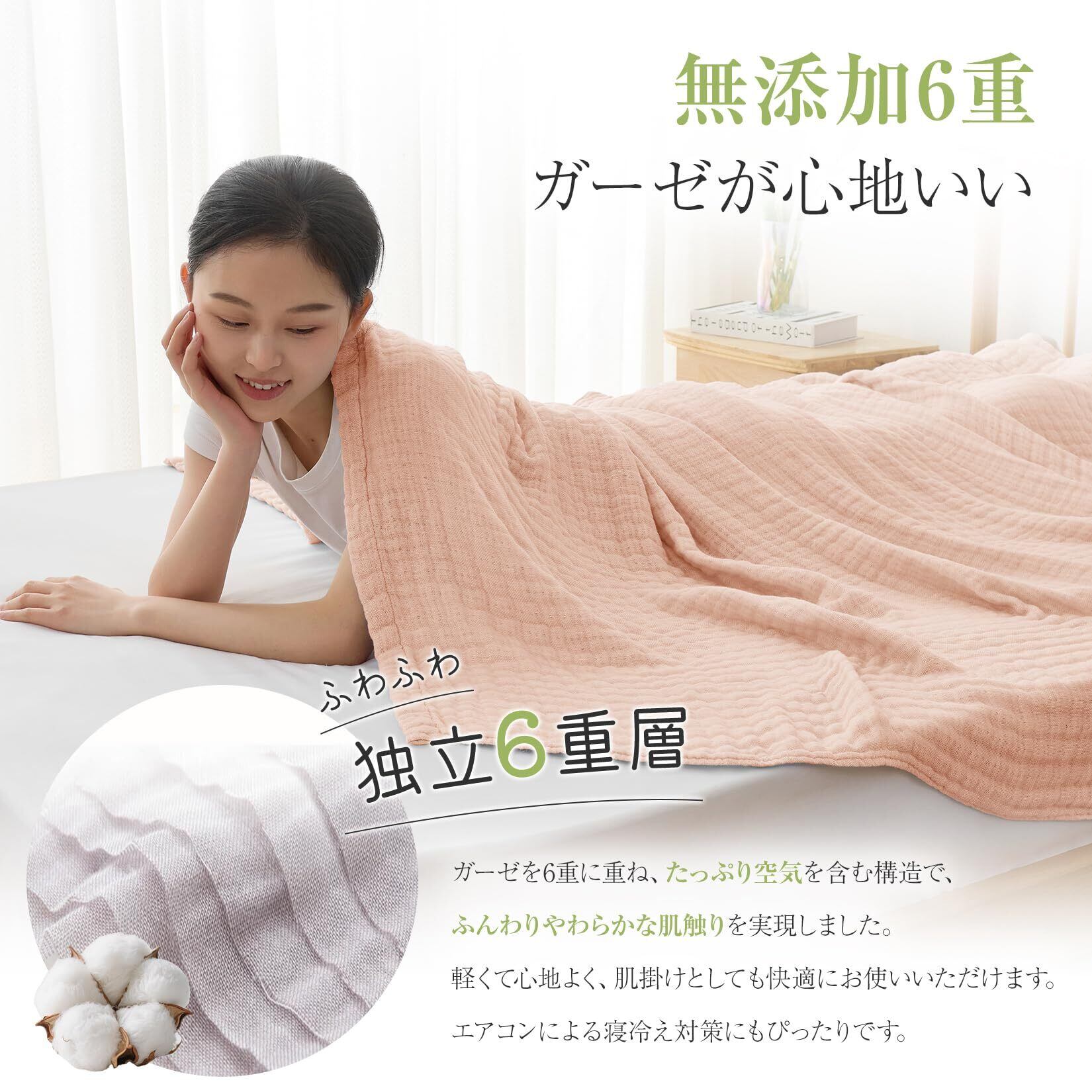 【6重ガーゼ構造】ふんわりでやわらか、肌かけ・肌触りもやさしく、軽い掛け心地になり、エアコンによる寝冷え対策にもぴったりです。