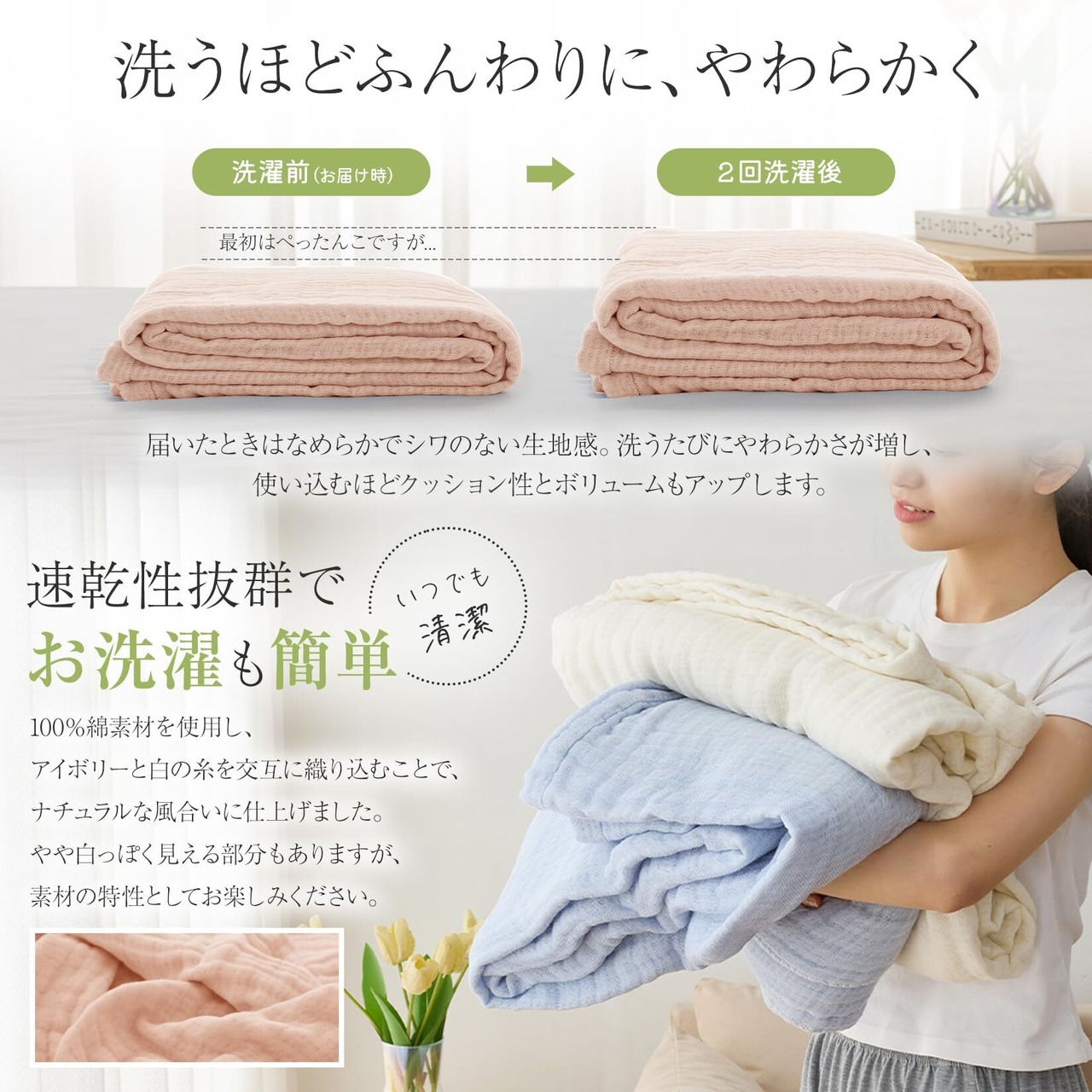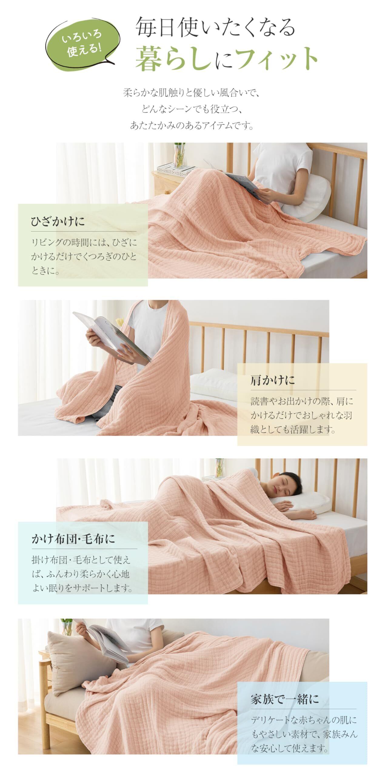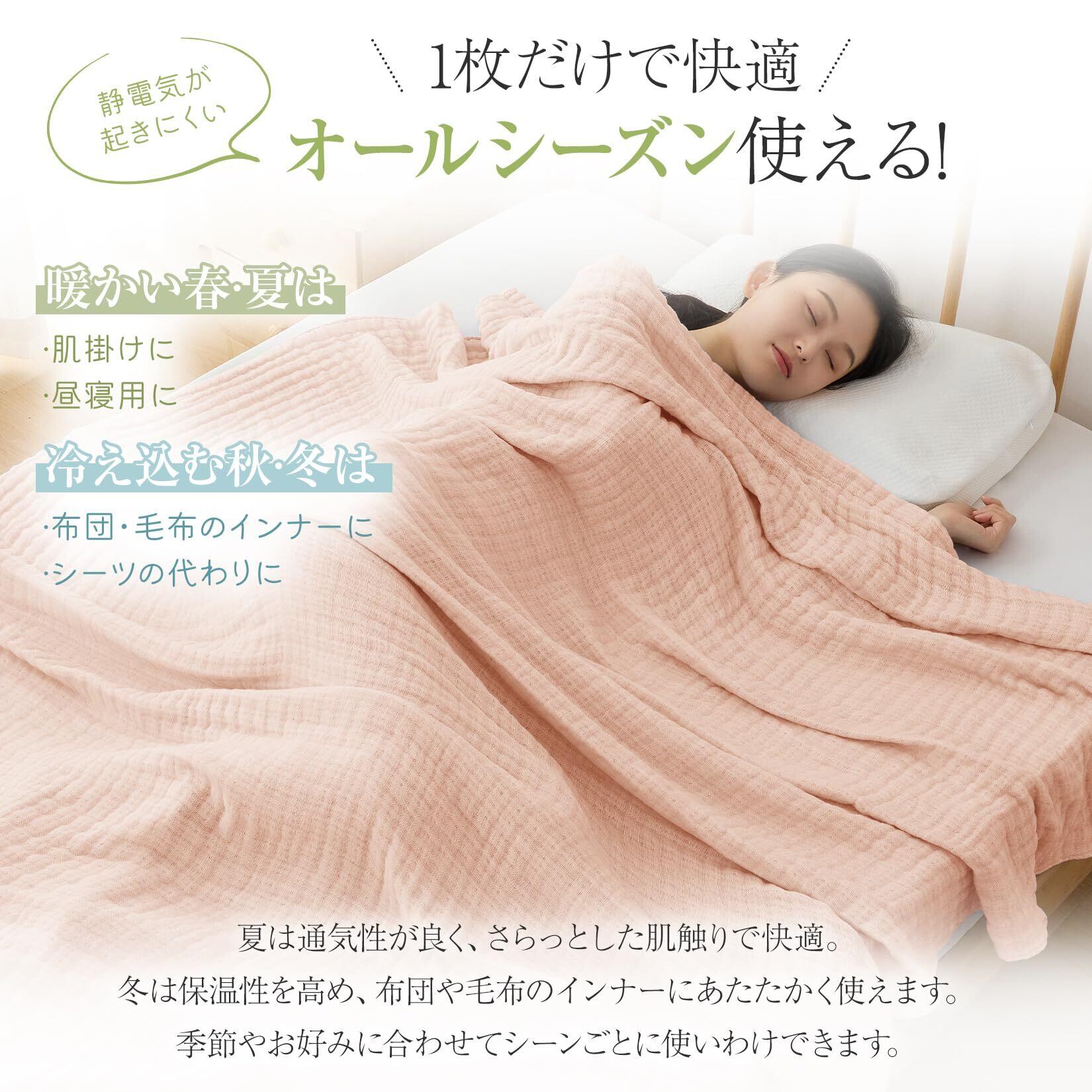 【オールシーズン使える】夏は通気性が良く、サラッとした肌触りに、冬は保温性を高めるので毛布がわりに、一年を通して快適にお過ごしいただけます。季節やお好みに合わせて、シーンごとに使いわけできます。