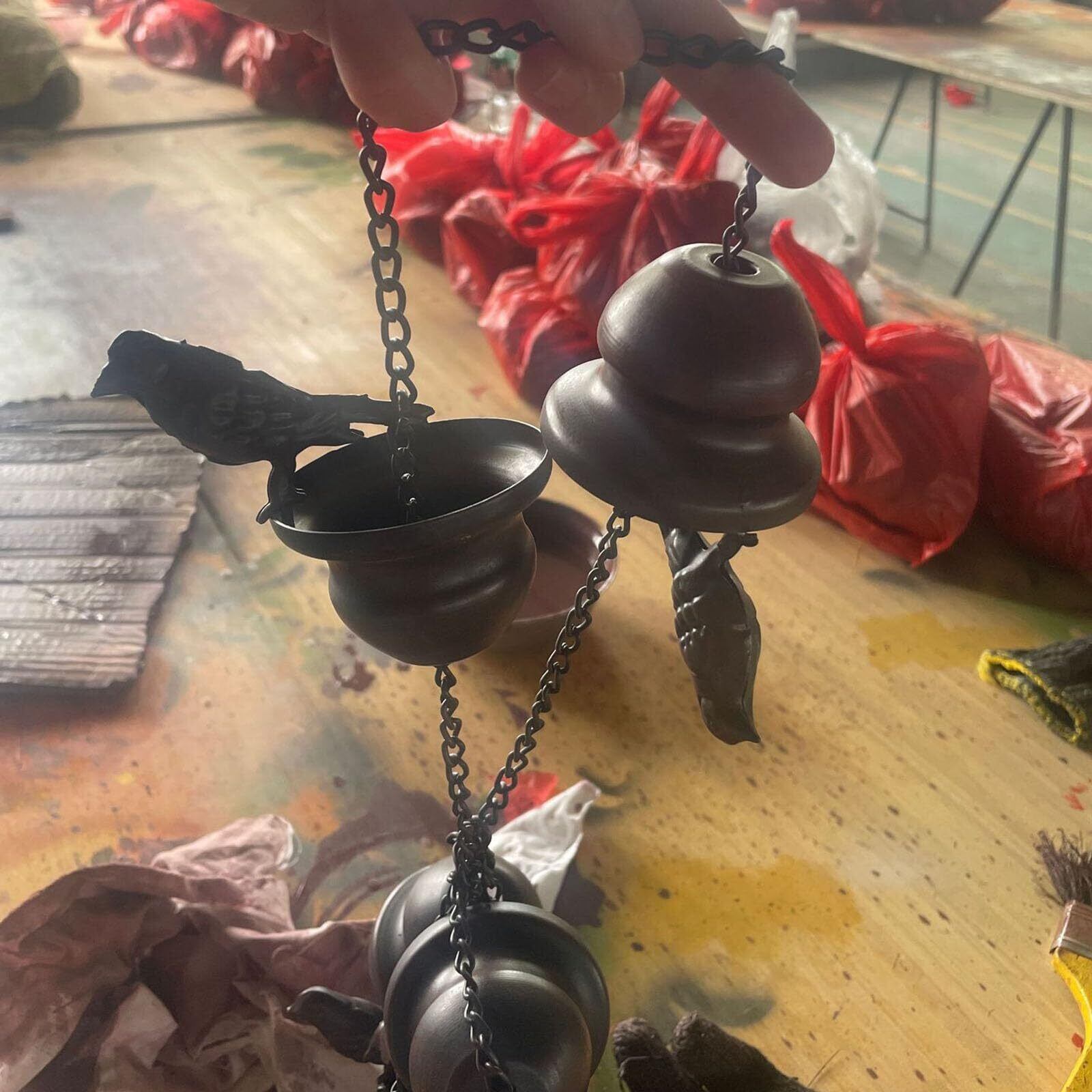 【風鈴・ウインドチャイム】底が開いたカップが漏斗の役割を果たし、水がスムーズかつ静かに流れます。風鈴とはまた違った音で癒されますね!玄関ドアに付けてみると、ほどよい音色が響きます。雰囲気でスタジオの片隅に吊ってます。魅惑的な雨滴の音がして癒されて幸せです。人々に幸運をもたらすことができます。