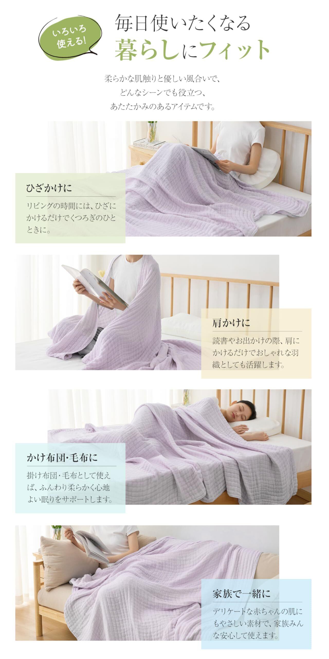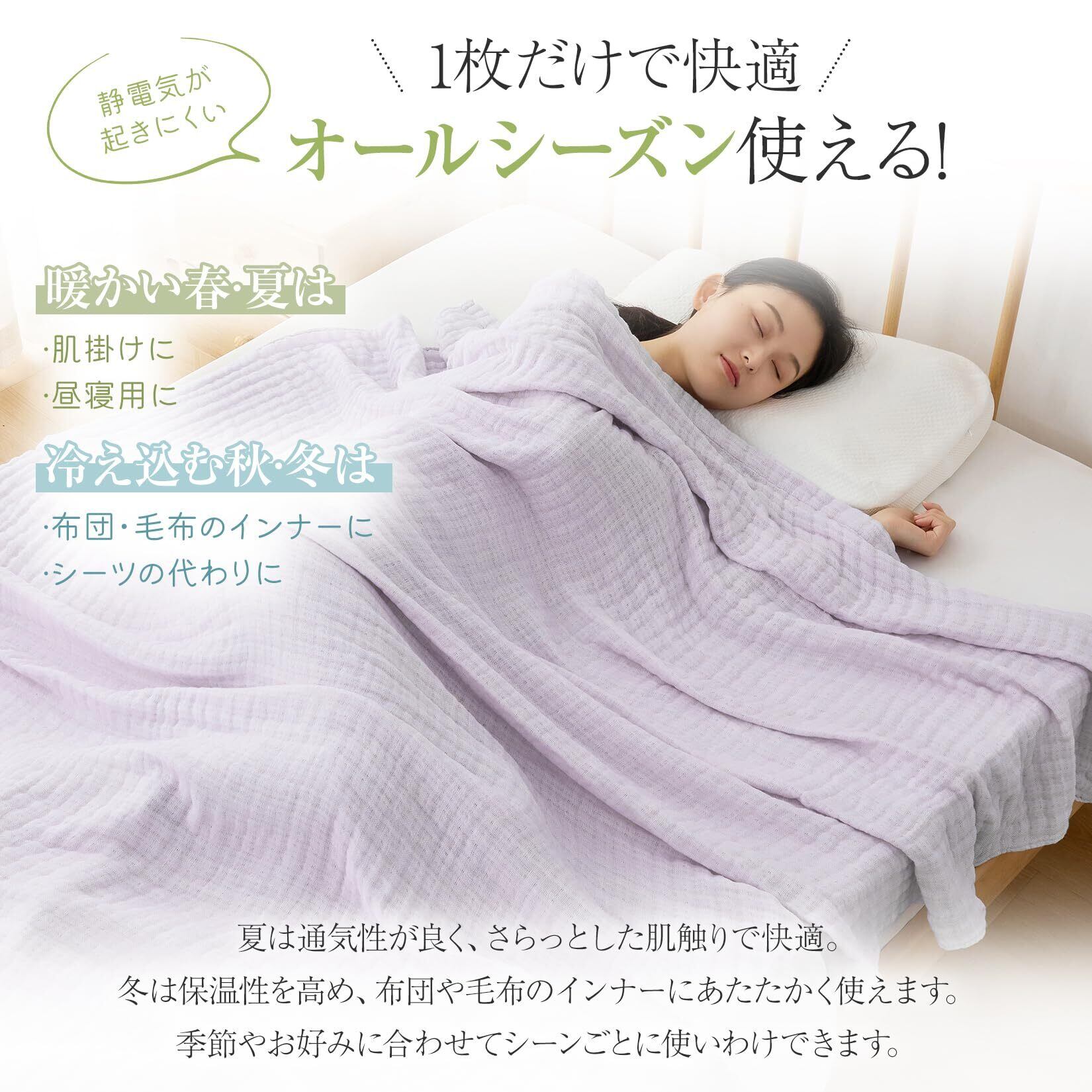 【オールシーズン使える】夏は通気性よく爽やかに、冬は保温性アップで布団や毛布代わりに活躍。一年中使えるガーゼケットで、季節やシーンに合わせて使い分けできます。