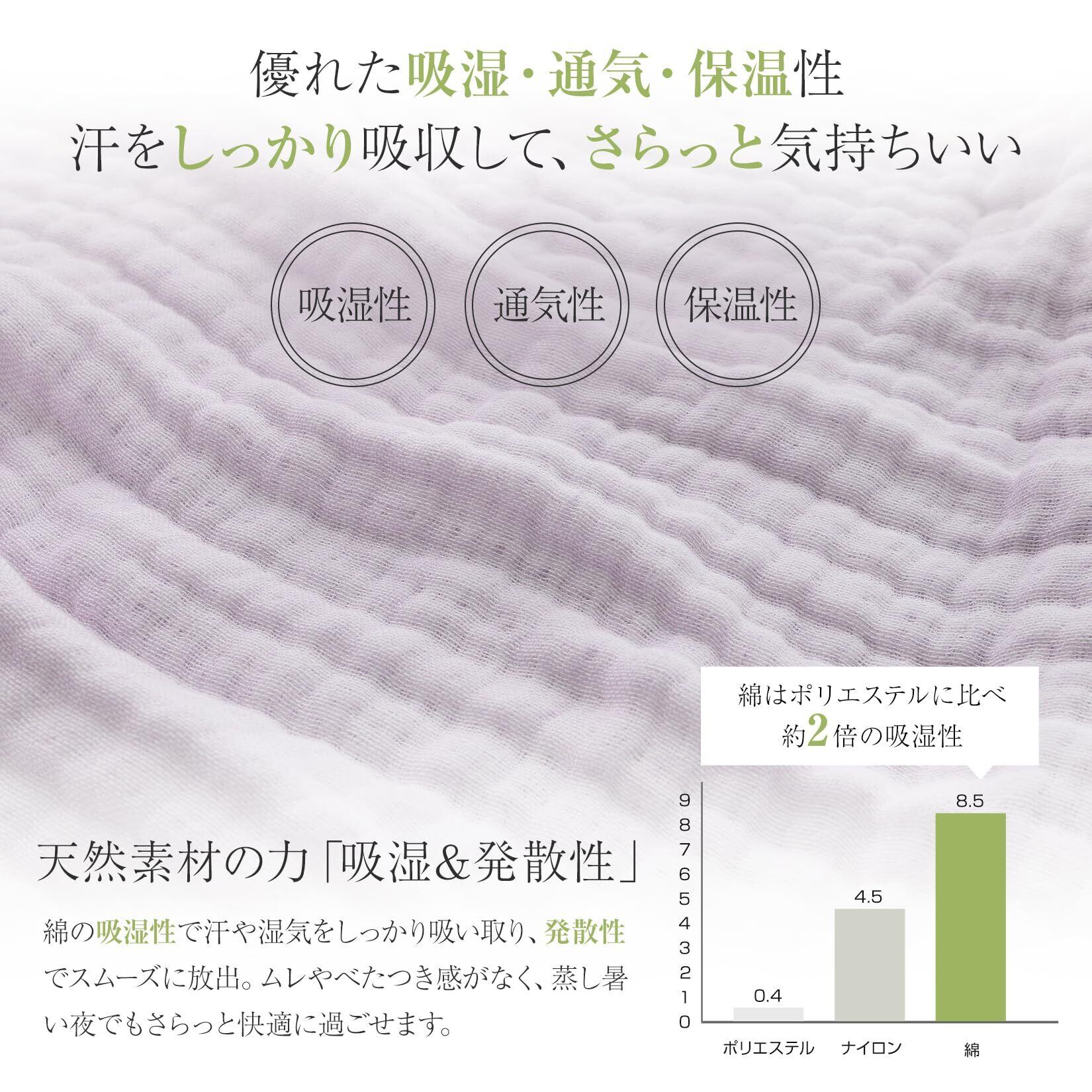 【優れた吸湿・通気性】汗をすばやく吸収して発散し、べたつかず快適。ほどよい厚みで肌にふんわりフィットし、蒸し暑い夜も冷房対策としても心地よくお使いいただけます。