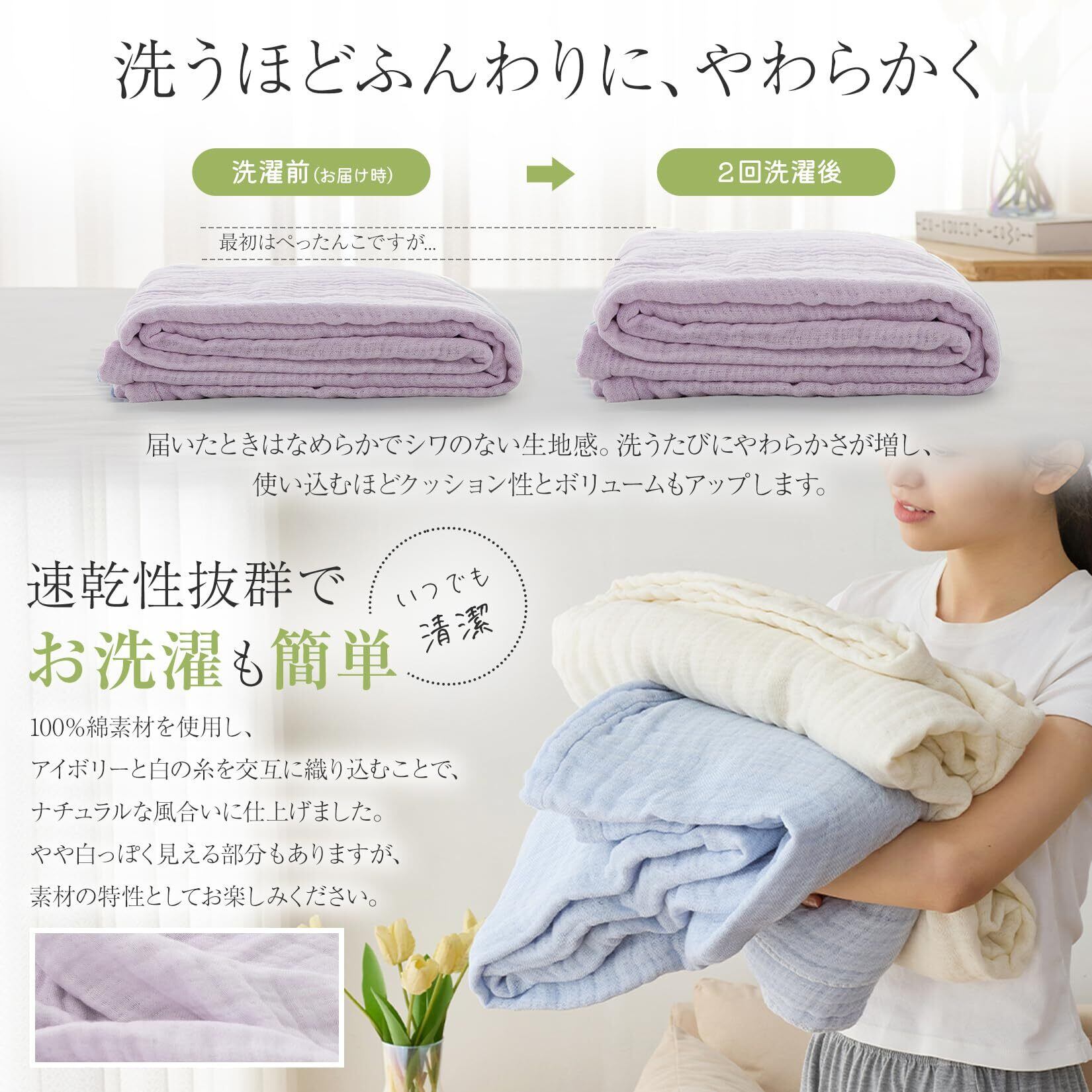 【速乾性抜群&丸洗いOK】洗うほど柔らかく育つガーゼ素材。ご家庭で楽々に丸洗いでき、乾きも早いので毎日清潔。夏場なら約半日でふんわり乾き上がります。(洗濯ネットに入れてお洗濯ください)