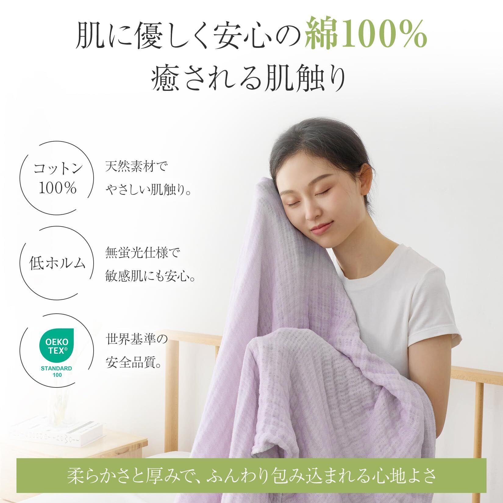 【天然綿100%素材】6枚重ねのガーゼが生み出す贅沢な柔らかさとほどよい厚みが魅力。パイルなしで静電気が起きにくく、季節を問わず心地よく使える人気素材です。