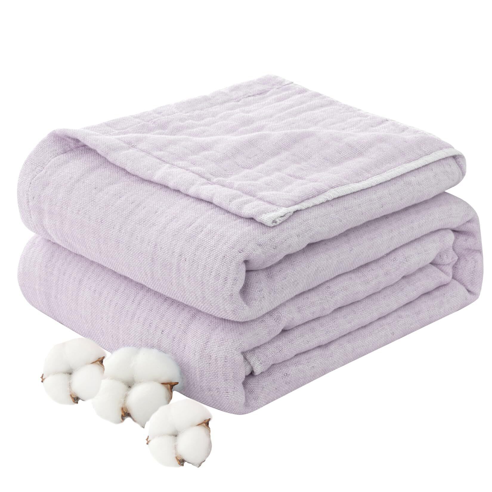 fuwawa ガーゼケット シングル 6重ガーゼ 天然綿100% 吸湿通気 綿 タオルケット お昼寝ケット 肌掛け ブランケット やわらか 肌に優しい 抗菌・防臭・防ダニ 軽量 洗える リバーシブル オールシーズン 冷房対策 140x190cm (無地,ラベンダー)