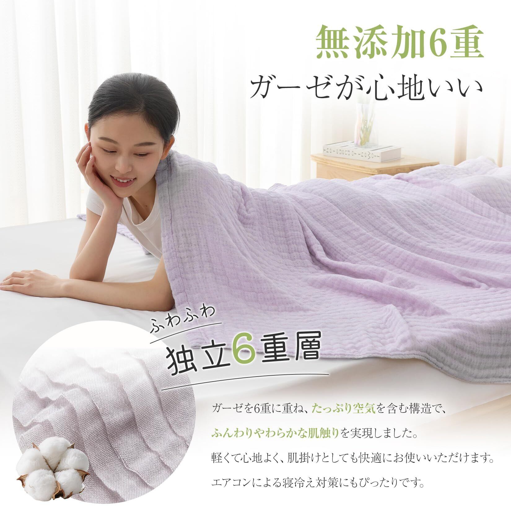 【無添加6重ガーゼケット】縫い糸まで無蛍光にこだわり、敏感肌・アレルギー・赤ちゃんにもやさしく、サラッと柔らかな肌触りで毎日快適に使えます。