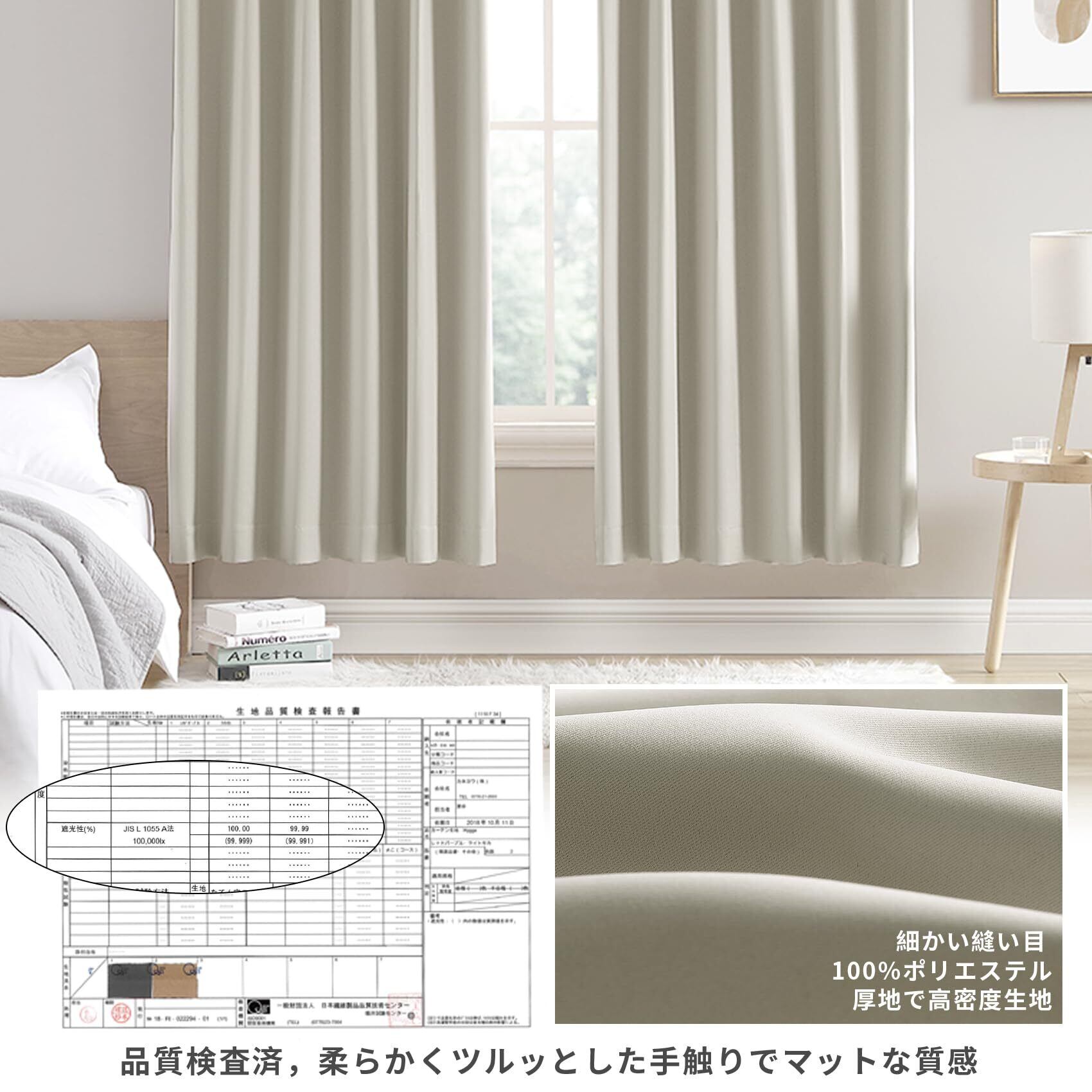 ◆【一級遮光】このカーテンは遮光度が99.99%以上,外からの光をほとんど通さないため、昼間カーテンを閉めたお部屋のなかで相手の顔の表情が分からない程度にまでお部屋を暗くできます。同じ等級であっても、カーテンの明度や色彩によって遮光の度合いが変わります。薄い淡い色は光を通しやすく、濃い暗い色は光を通しにくいです。遮光性を重視される方は濃色をおすすめします。