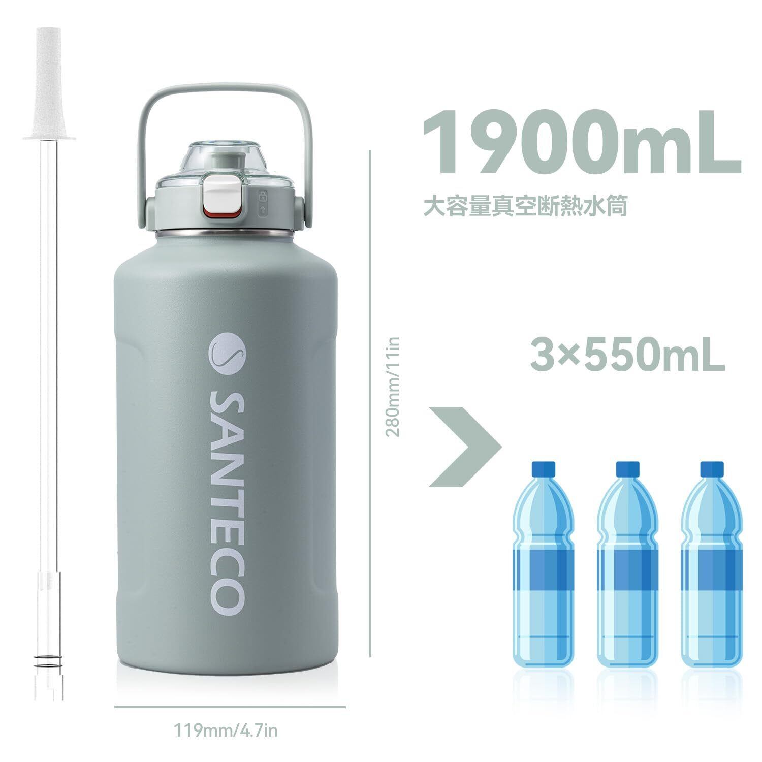 SANTECO 水筒 真空断熱 大容量 魔法瓶 保冷 保温 1900ML ストロー付き 直飲み スポーツドリンク対応 おしゃれ 広口 ステンレスボトル ERIE アッシュブルー