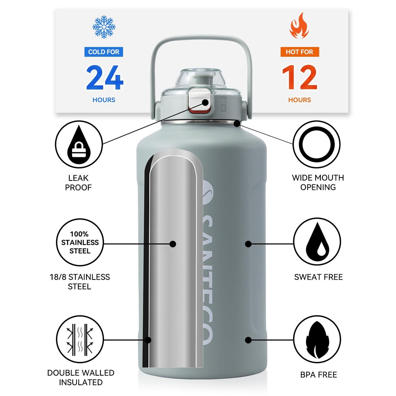 【優れた保温・保冷力】SANTECO真空断熱水筒ERIEシリーズは、優れた保温・保冷力を備えています。真空断熱二重構造により、保温時間は12時間、保冷時間が24時間に達します。寒い時でも暑い時でも飲み物を美味しい温度にキープします。