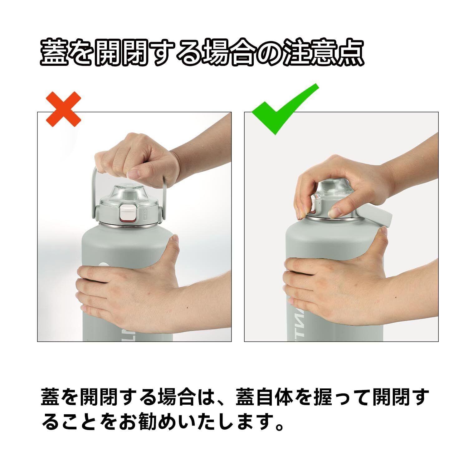 【1900ML大容量】1900MLの大容量で、ハイキング・キャンプ・ピクニック・スポーツなどのシーンで水をゴクゴク飲めます!使用上の注意:蓋を開閉する場合は、ハンドルではなく蓋を握って回してください。