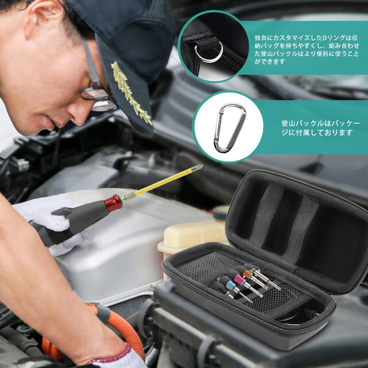 【最新改良デザイン】円錐形電動ドライバー専用に設計された保護ケースで、内部サイズは14.5 x 6 x 5.5 cmで、現在市場に出回っているすべての円錐形ドライバーを収納可能です。内部構造は何度も研究と改良を重ね、ドライバー本体と大部分のパーツを収納できるようになり、固定位置にはゴムバンドとメッシュ布の組み合わせを使用して、ケース内にしっかりと固定されます。外部はPUレザーを使用しており、非常に優れた防水・防塵性を持ち、89gの軽量設計で、登山用カラビナが付属しているため、より便利に携帯できます。(電動ドライバー及びアクセサリーは含まれません)