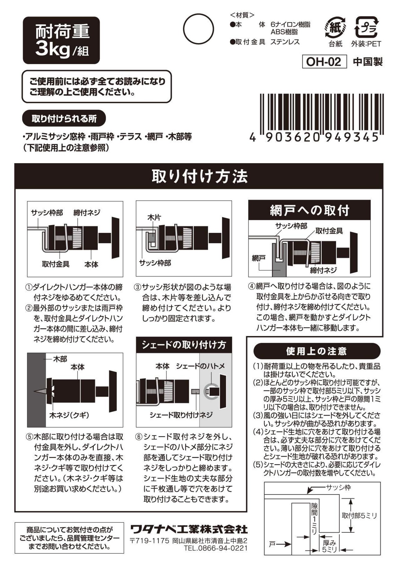 ワタナベ工業 オーニング用ダイレクトフック