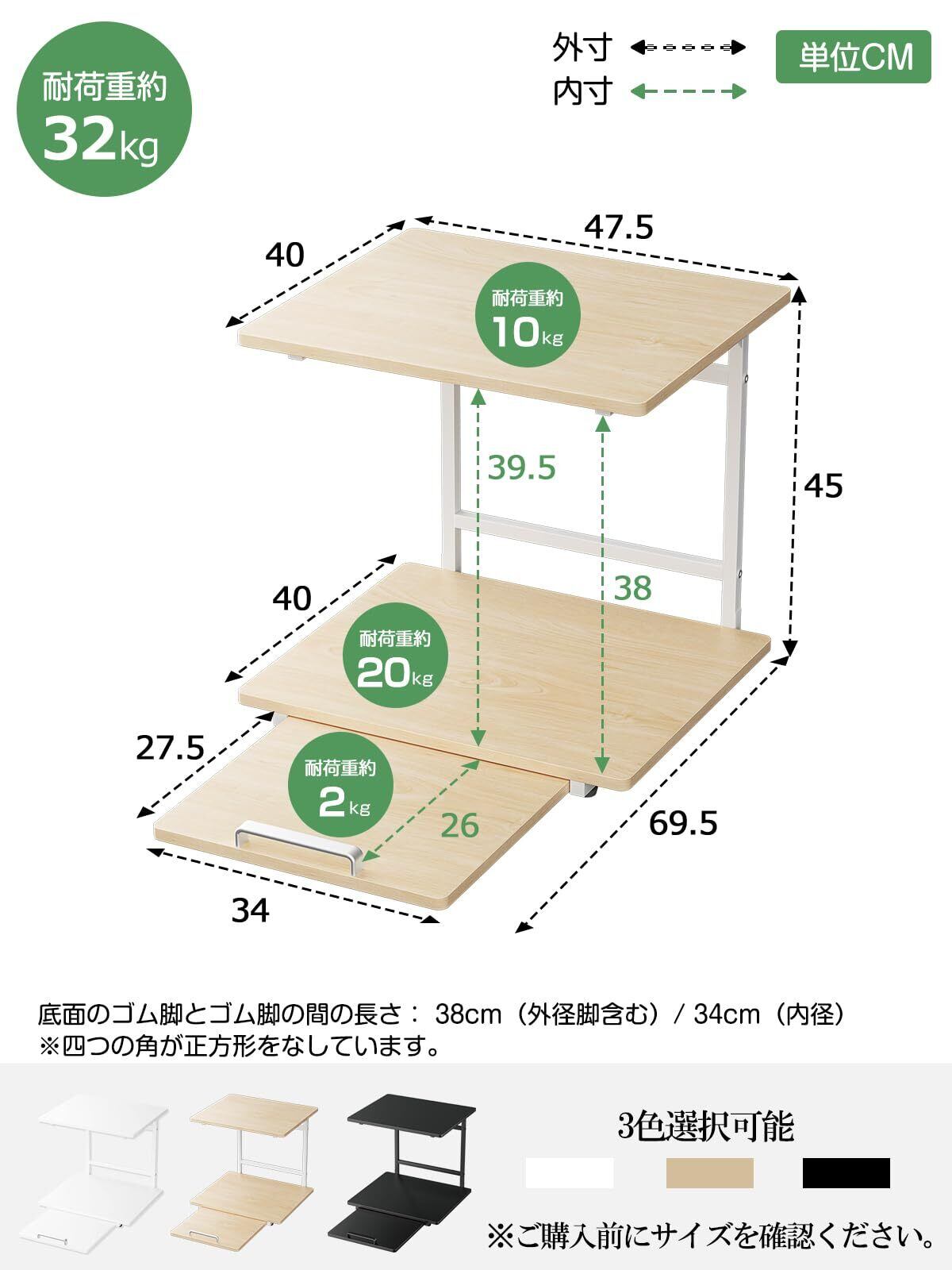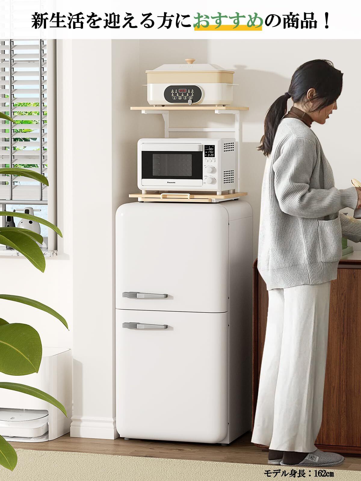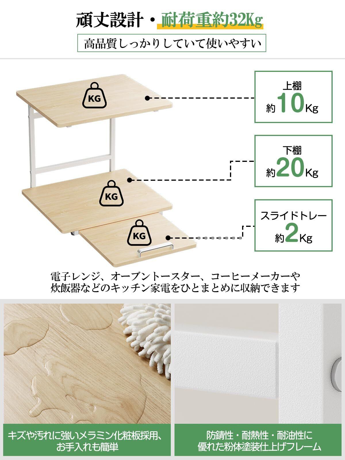 【頑丈設計・耐荷重約30Kg】2024年最新の電子レンジラックは三角ブラケットを装備しました。従来の仕様より耐荷重能力を高めます。重い調理家電も置ける頑丈仕様です。耐荷重は上棚約10Kg、下棚約20Kg、スライドトレー約2Kgです。電子レンジ、オーブントースター、コーヒーメーカーや炊飯器などのキッチン家電をひとまとめに収納できます。