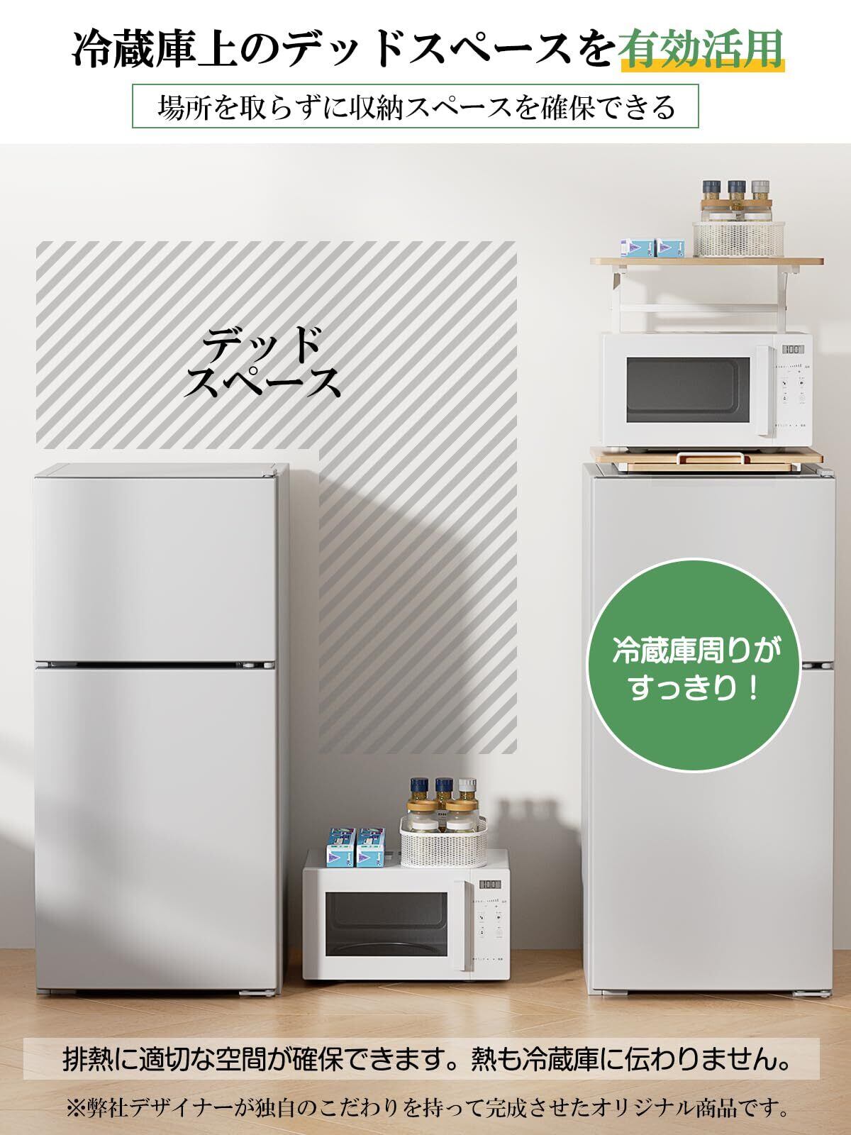 【キズや汚れに強いメラミン加工】キッチンは日々の調理や生活で汚れやすい場所。汚れにくく、耐水性に優れた低圧メラミン化粧板を使用、汚れてもサッと拭くだけだから、お手入れラクラク。フレームは防錆性・耐熱性・耐油性に優れた粉体塗装仕上げで、水回りやキッチンでもキレイが長持ち。レンジ棚の足が内側に配置されているので、冷蔵庫の蝶番に干渉せず、バルミューダレンジなどもサイズピッタリで完璧な配置になれます。また、ゴム脚を採用し、冷蔵庫や家具に傷つけにくいです。