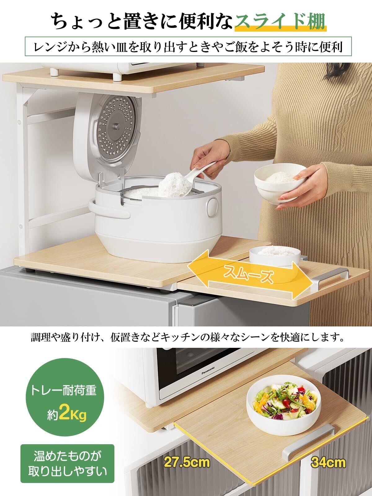 【ちょっと置きに便利なスライド棚】料理の一時置きができるスライド棚は、レンジから熱いお皿取り出すときにも便利。片手でサッと引き出すだけで、「ちょい置き」スペースに。料理の盛り付けや下準備、調理器具・食材の仮置きなど、調理のさまざまなシーンで大活躍スライド式ラック。取っ手がコンパクトで全くレンジの扉と当たることなく。スライドトレーは最大約28cm引き出せます。