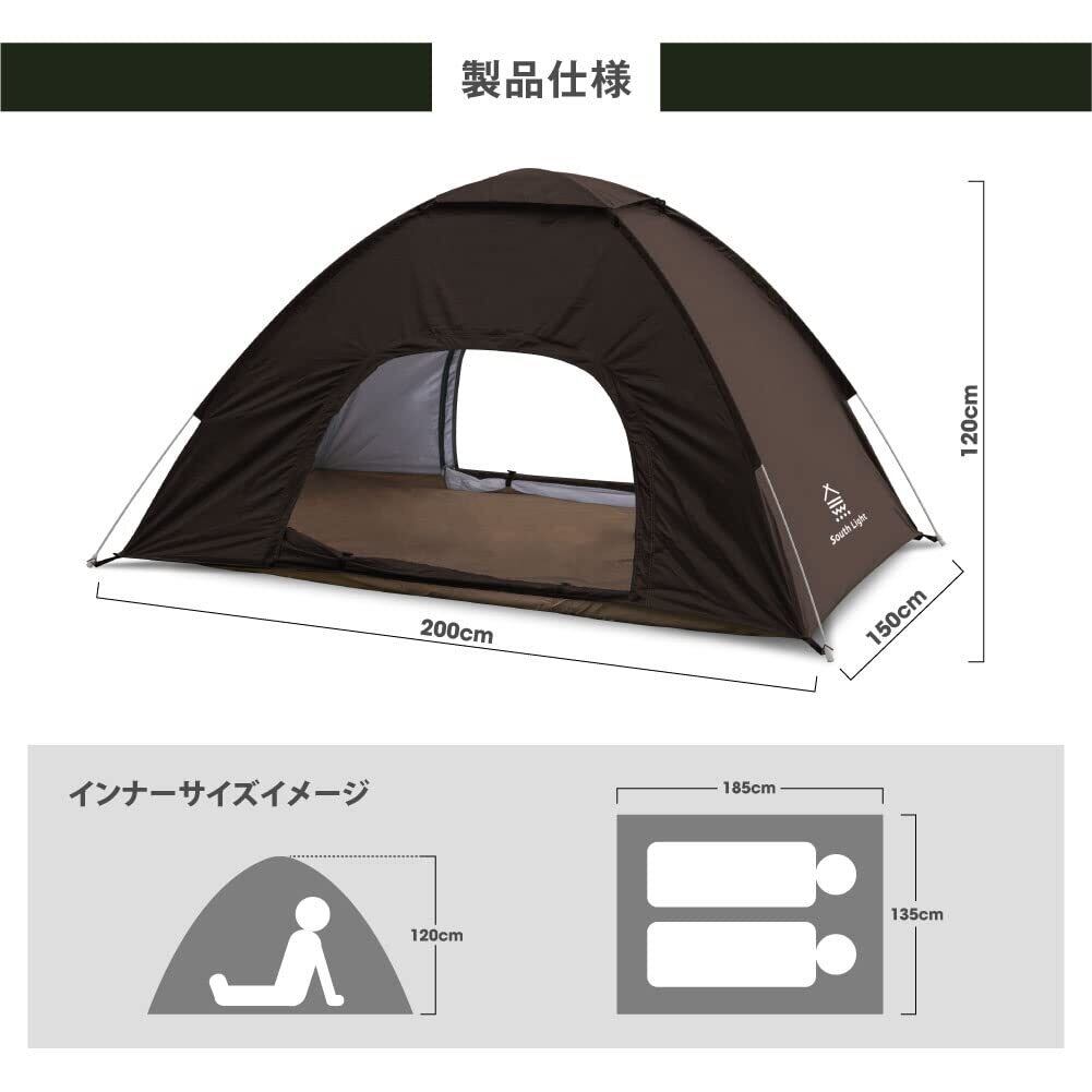 【ワイド2人用テント/防災テントとしても活躍】キャンプやレジャーなどで簡単、快適に使えるSouth Lightのホップアップテントです。収納キャリーバッグから取り出すとワンタッチで広がるホップアップ式。わずか約30秒で完成します。就寝2人用でも200㎝のワイド設計。フロントシートを広げれば、さらにゆったりの解放感、くつろぎを楽しめます。開閉用のフロントシート(扉)をファスナーで密閉すればフルクローズ仕様になり、着替えなどのプライバシー保護が図れて便利で、しかも安心です。非常時に防災テントとしても役に立ちます。