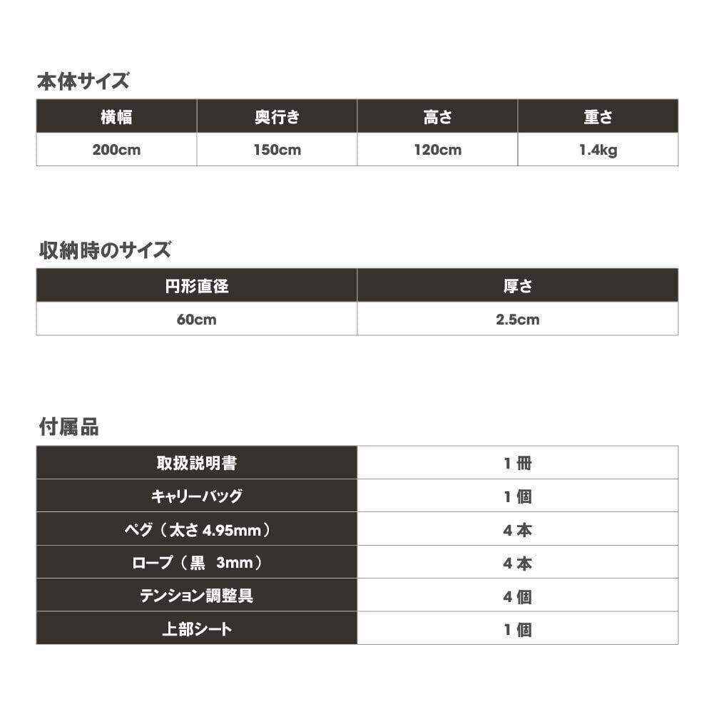 (仕様) 製品名:ホップアップテント 型番:sl-zp150-iv 材質:ポリエステル(オックスフォード織)、グラスファイバー(フレーム) サイズ:組立時 約W200×H120×D150㎝ 収納時 約Ø60×t2.5㎝ カラー:アイボリー 重量:約1.4kg 付属品:収納キャリーバッグ(ポリエステル製)