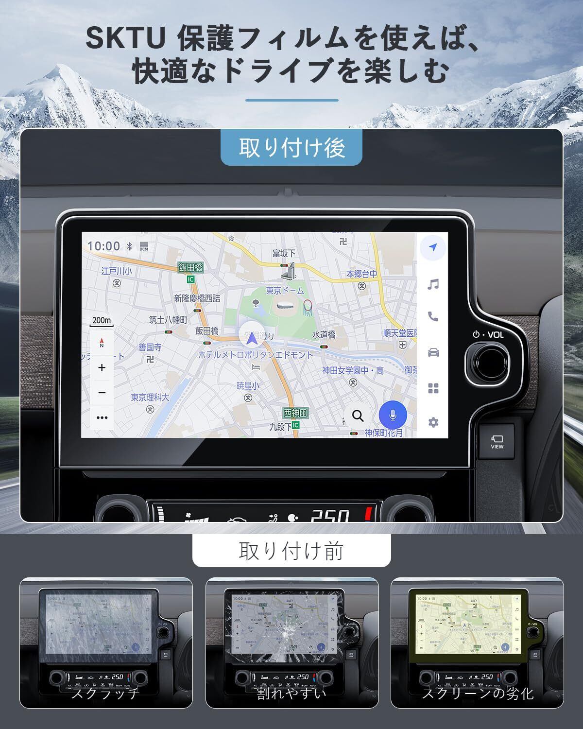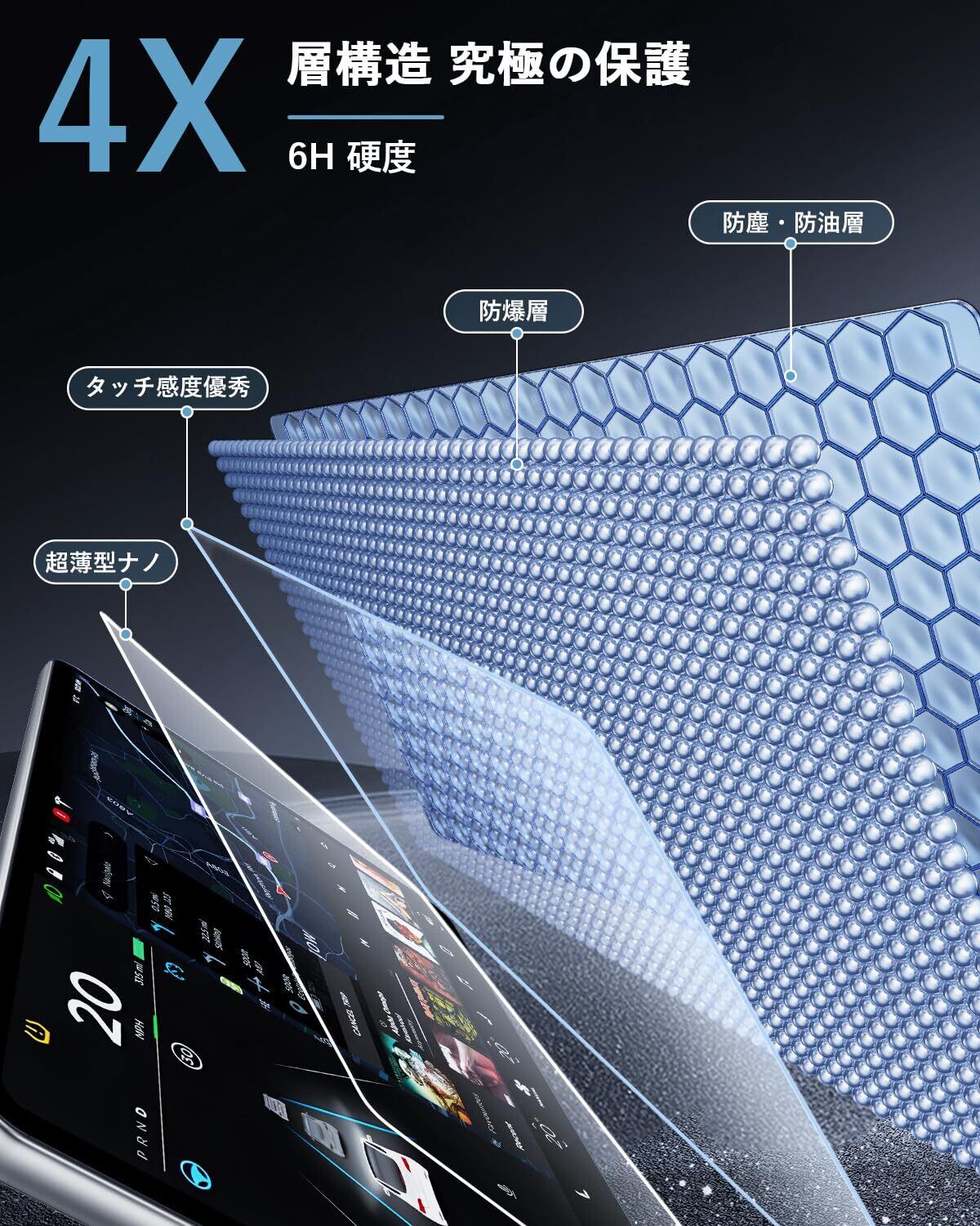 【数多くのメリット】指紋軽減、飛散防止、汚れ防止、キズ防止、高感度タッチ。愛車を全方面に保護します。優れた画質で、 装着していることも忘れてしまうほどナビをしっかりと守ってくれます。ナビ視認性が素晴らしくて、スムーズな操作体験が実現できます。反射防止のため、画面がクリアで見やすくなります。