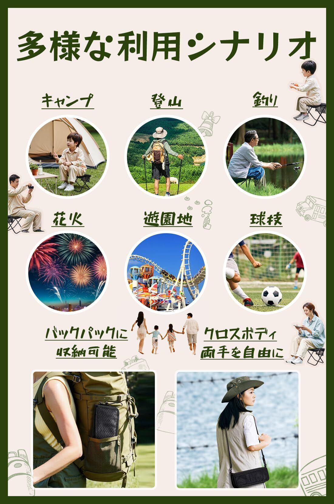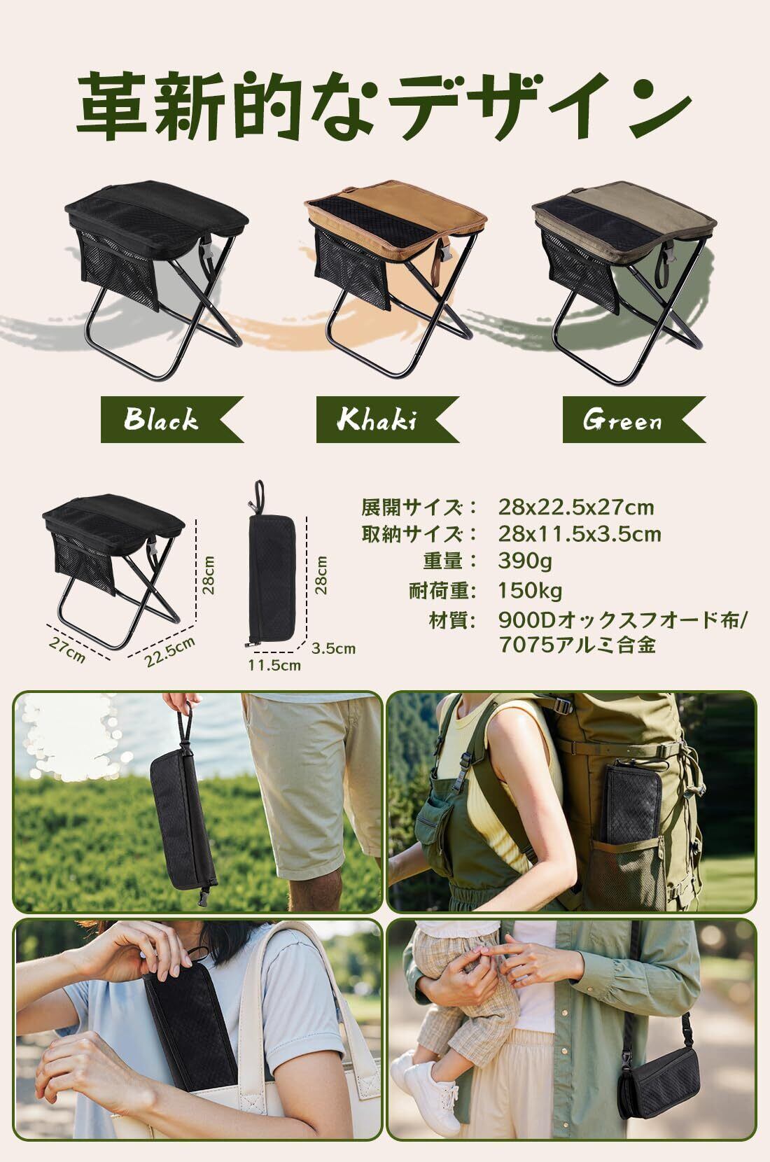 ️【超軽量・ショルダーストラップ付き】折りたたみ椅子チェア本体の重さはわずか390g!折りたたみ椅子取り外し可能なので、斜め掛けバッグにもなります。付属のショルダーストラップは肩に掛けやすく、両手が自由になり、動きがスムーズです。お子様を抱っこしたり、重いものを運んだりするのに最適です。折りたたみ椅子 コンパクトは両手を自由にします。忙しい親子の負担を軽減します。