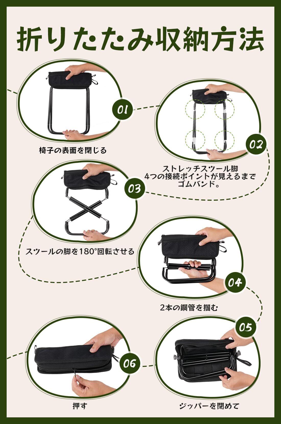 ️【サッと広げて収納】ファスナーを開けてフレーム部分を引き出して組み立てるだけ!サッと取り出してサッと収納できます。注意:1.折り畳み椅子 アウトドア 組み立て時や保管時は、指や手を挟まないように注意してください。お子様だけで製品の組み立てや保管を行わないでください。 2) コンパクト 椅子を使用する前に、8 つのパイプジョイントが完全に正確に接続されていることを確認してください。