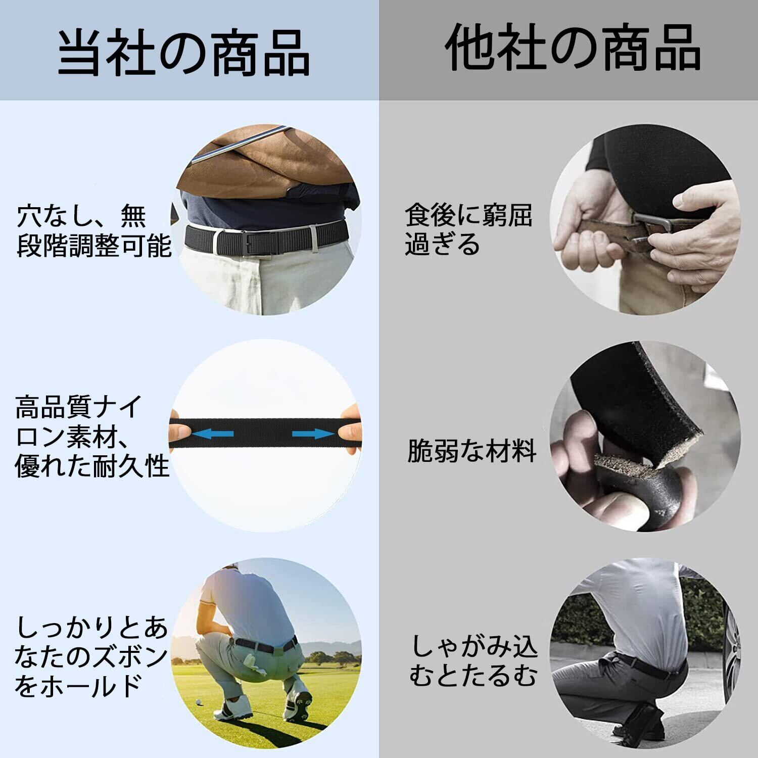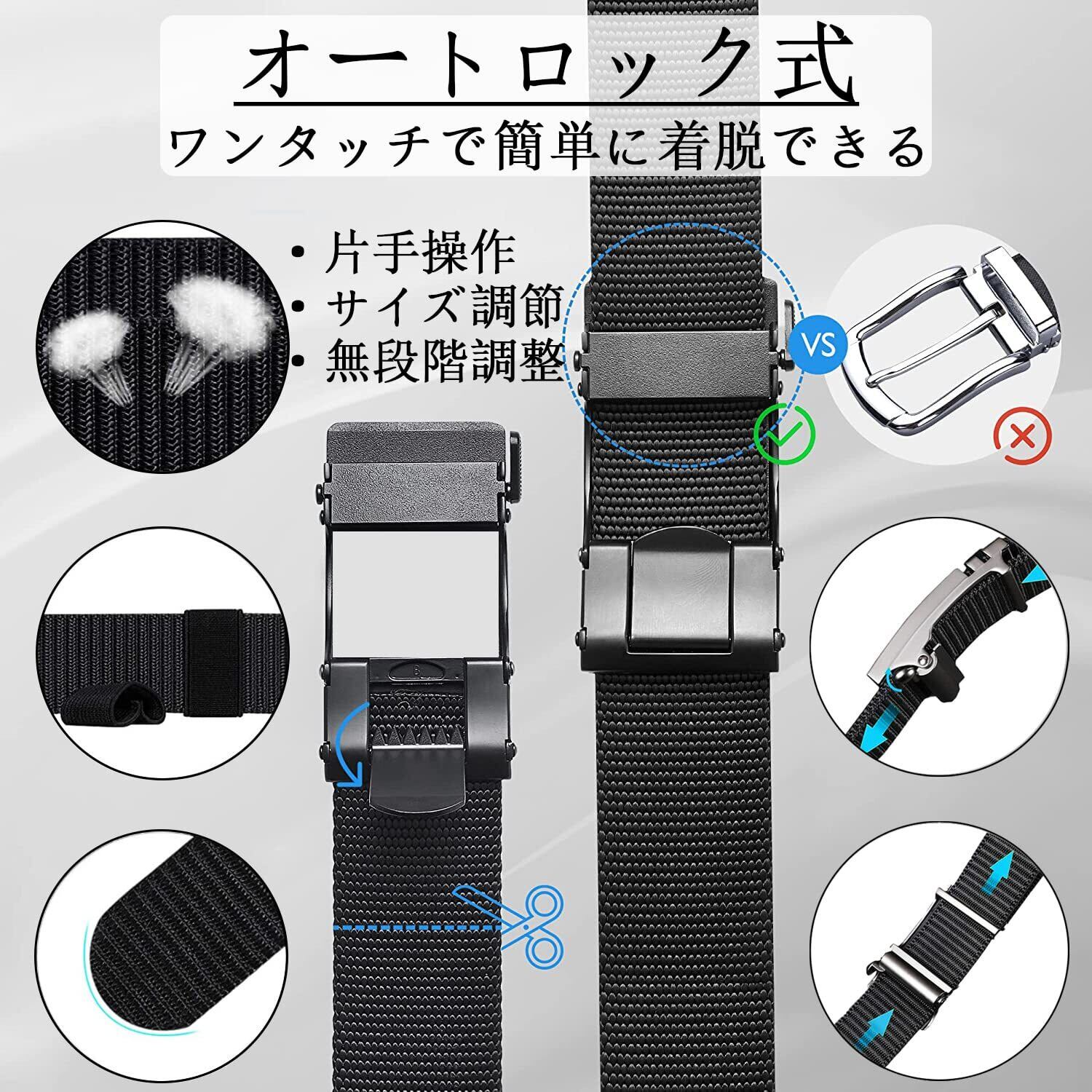 【高品質】 強化バックルは頑丈で丈夫かつ軽量で、外圧に強く耐えます。高品質なベルトなので、ハードな使用でもびくともしません。また、革ベルトとは異なり、様々な体型・ウエストにフィットする無段階調整が可能で、好きな位置で長さを調整できます。どんな体型の方でも気軽に着用でき、長時間のドライブや旅行、会食なども窮屈感なく利用できます。