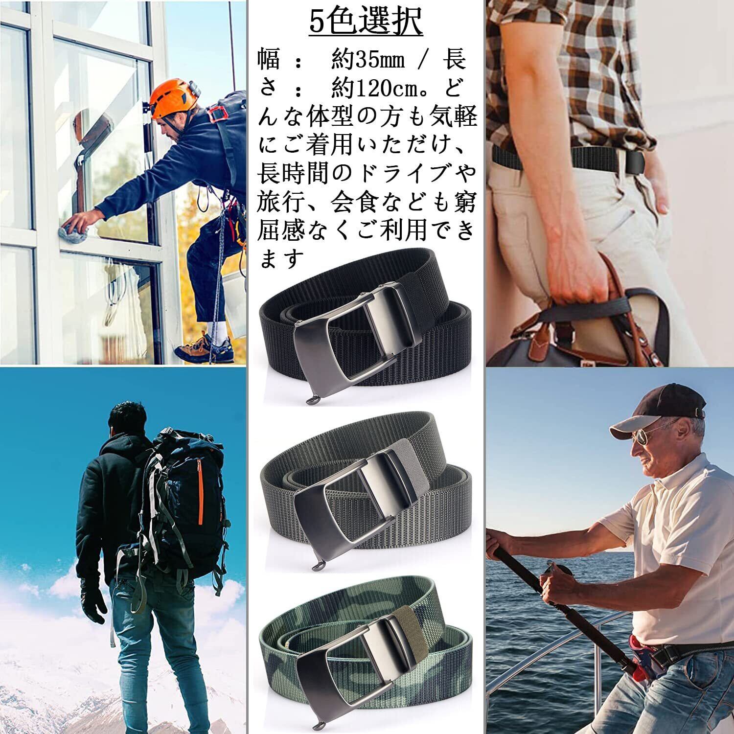 【自由なサイズ調節】 幅は約35mm(標準サイズ)、長さは約120cmです。ナイロンベルトは余裕を持たせた長さで設計されており、ハサミで簡単に裁断することができます。※簡単なカット手順:①バックル裏側の固定金具を開けてからベルトを引き抜く ②お好みの長さを挟みでカットする ③カットしたベルトをバックルに差し戻す ④固定金具を押し戻す。穴が無く、好きな位置で固定するタイプのベルトです。無段階で微調節が可能で、様々なサイズに対応します。穴開けの必要もありません!